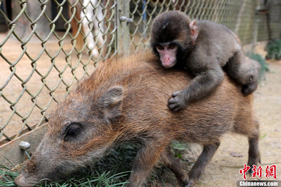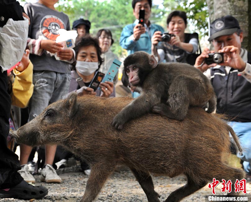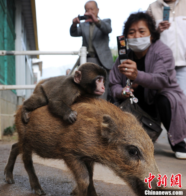 10月19日,日本京都轄區(qū)內(nèi)的福知山動(dòng)物園里,兩只小動(dòng)物成了大家眼中的明星:名叫Uribo的小公野豬經(jīng)常馱著小猴子Miwa跑來(lái)跑去,吸引大量游客前來(lái)觀看,并且給它們拍照。他們都是失去了母親的孤兒,福知山動(dòng)物園將他們收養(yǎng)。