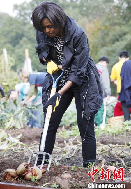 10月20日,美國華盛頓,美國第一夫人米歇爾·奧巴馬與小學生一起收獲白宮菜園里種植的菜蔬。
