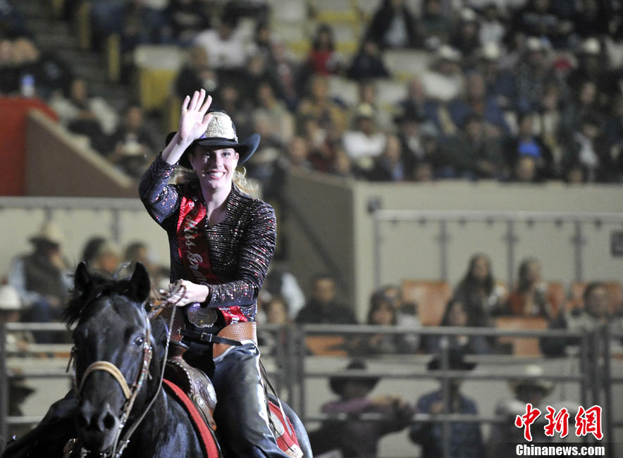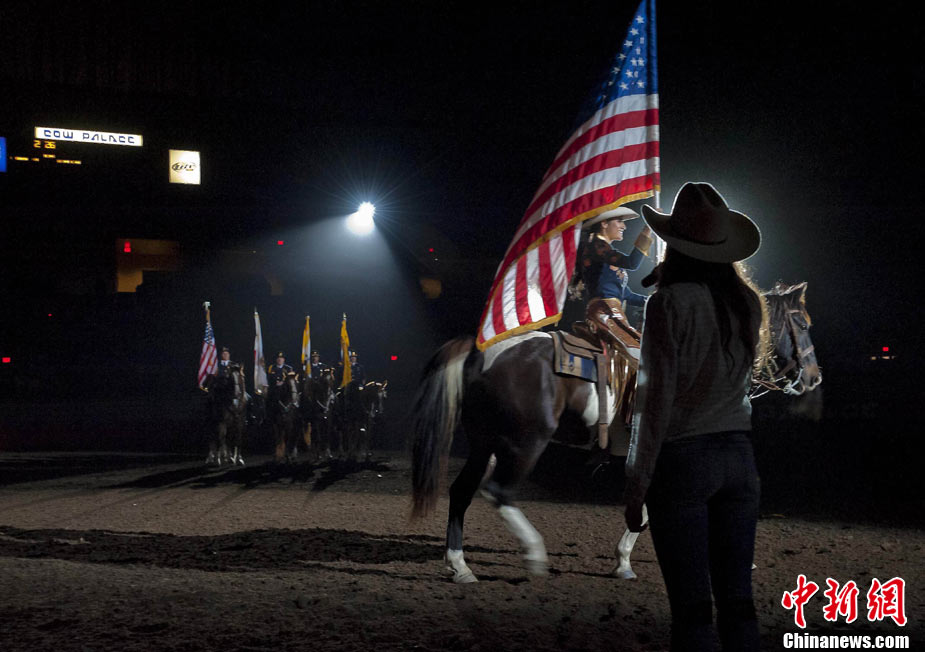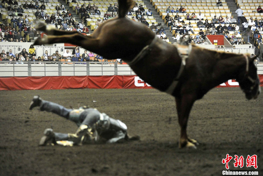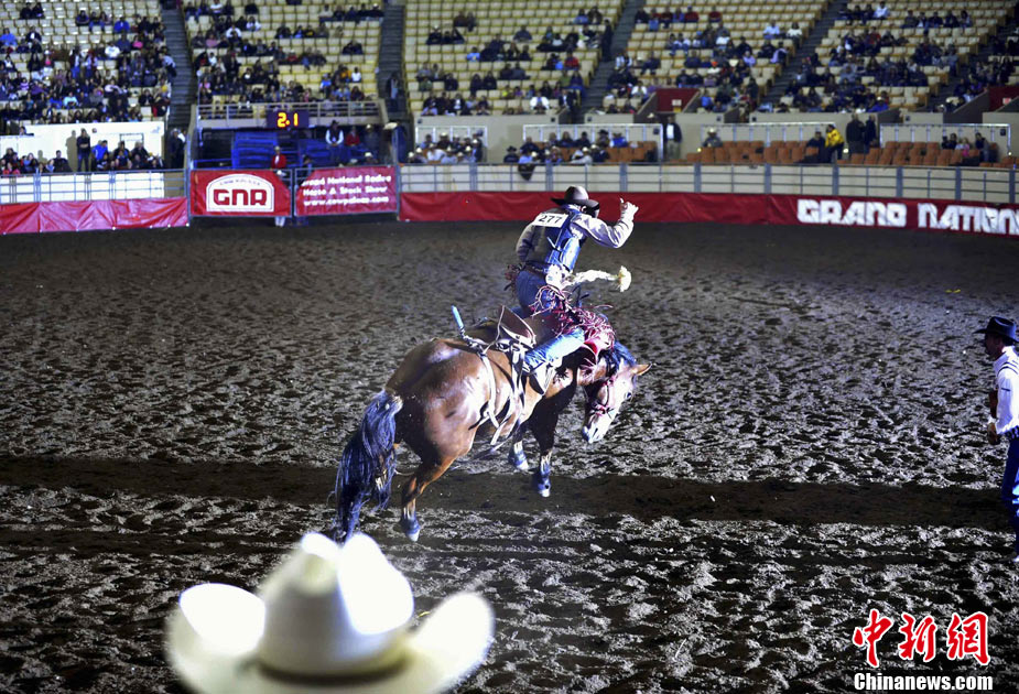 為期四日的全美騎術大會在舊金山的牛宮(Cow Palace)舉行。來自全美多個州的專業和草根牛仔參加表演,舉辦者預測將會吸引兩萬名左右的觀眾前來參觀。舊金山的全美騎術大會始于1941年,是全美專業騎術大會的前奏。圖為一名牛仔在努力馴服烈馬。中新社發 陳鋼 攝