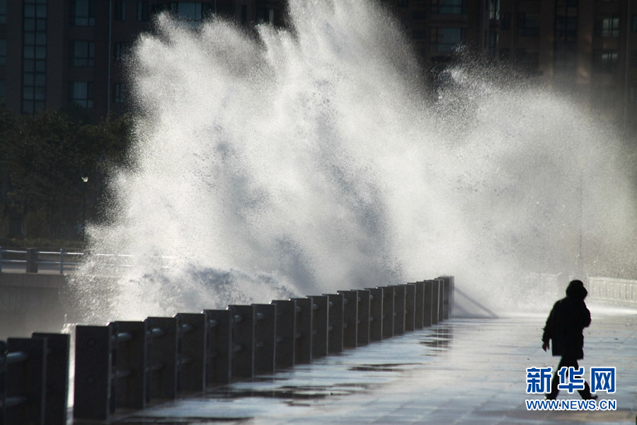 10月25日,一名行人從山東威海海濱掀起的浪花旁走過。當日,受強冷空氣影響,山東威海海上風力達8至9級,陣風風力達到11級,海濱大浪排空,威海市海上搜救中心發布海上風險黃色預警。于啟波 攝 圖片來源:新華網