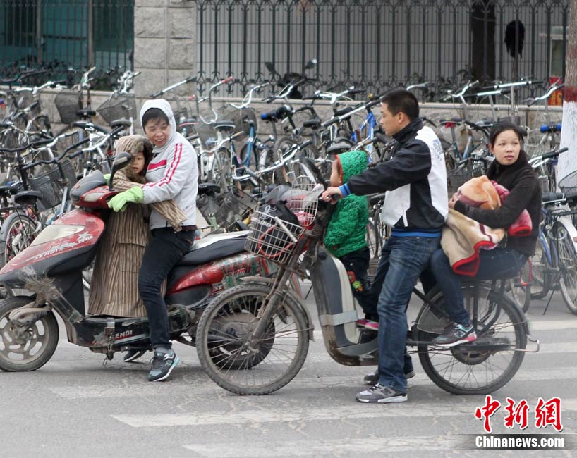 10月26日,河南鄭州,由于遭遇近5年來同期最強寒潮天氣襲擊,鄭州氣溫驟降,民眾出行都換上了厚厚的棉衣。據中央氣象臺發布:強冷空氣將繼續東移南下,中國南方部分地區氣溫將下降6~8℃,部分地區降溫幅度可達10℃。中國東部和南部海區在冷空氣的影響下,還將刮起9~10級風。中新社記者 王中舉 攝