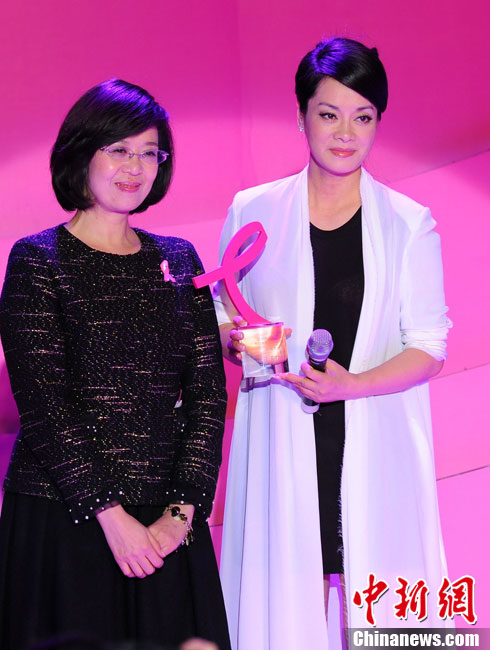 10月26日晚,《時尚健康》粉紅絲帶盛典在北京盛大舉行。歷屆粉紅絲帶代言人代表毛阿敏、柯藍(lán)與今年的代言人海清、張雨綺共同登上粉紅舞臺,江映蓉、愛戴、葉蓓、翁虹、范志博、鞏新亮、孟倩、李鑫雨等眾星云集。目前,“粉紅絲帶乳腺癌防治運動” 已成為中國最具影響力的時尚公益活動之一。圖為張雨綺、海青與眾嘉賓合影。中新社發(fā) 李學(xué)仕 攝