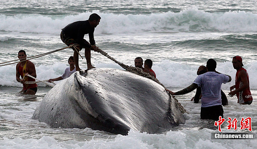 當地時間10月26日,在距離巴西里約熱內盧192公里的布濟烏斯,救援人員試圖挪動擱淺的座頭鯨。座頭鯨每年7月到11月從南極洲向北遷往巴西海域交配。