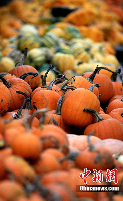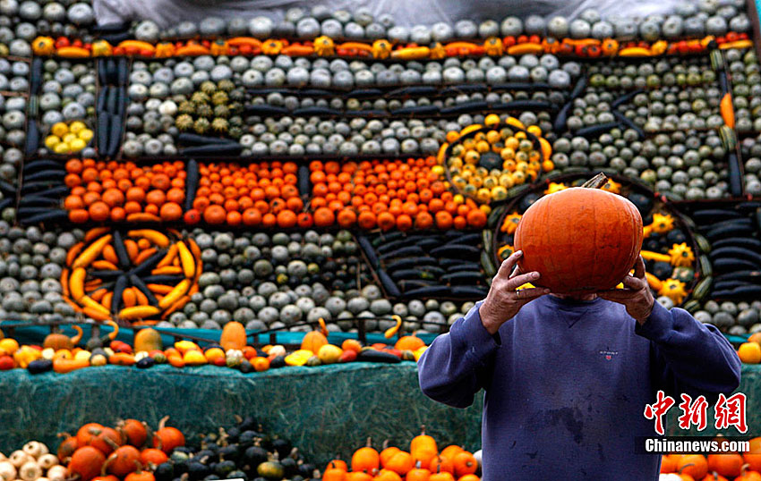 萬圣節到來的前夕,英國斯林登老農托尼·史密斯將自己種植數百只南瓜堆成牽引機車的模型。