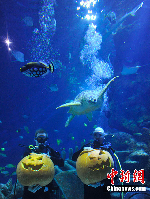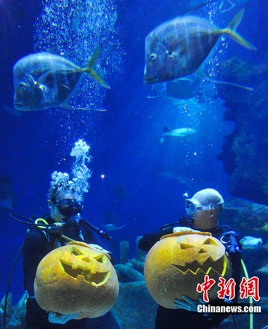 潛水員水下雕南瓜宣傳倫敦水族館萬圣節活動