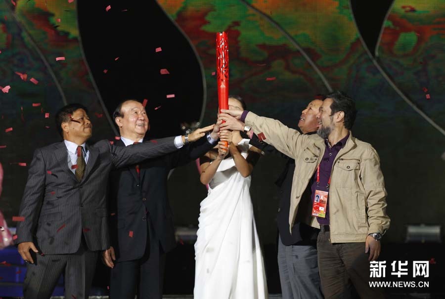 11月2日,歌手楊千嬅(中)在晚會上演唱。當日,2010廣州亞運會倒計時10天主題歌會在廣州舉行,來自內地、香港的明星和中國羽毛球隊一起唱響激情亞運。孟永民攝 圖片來源:新華網