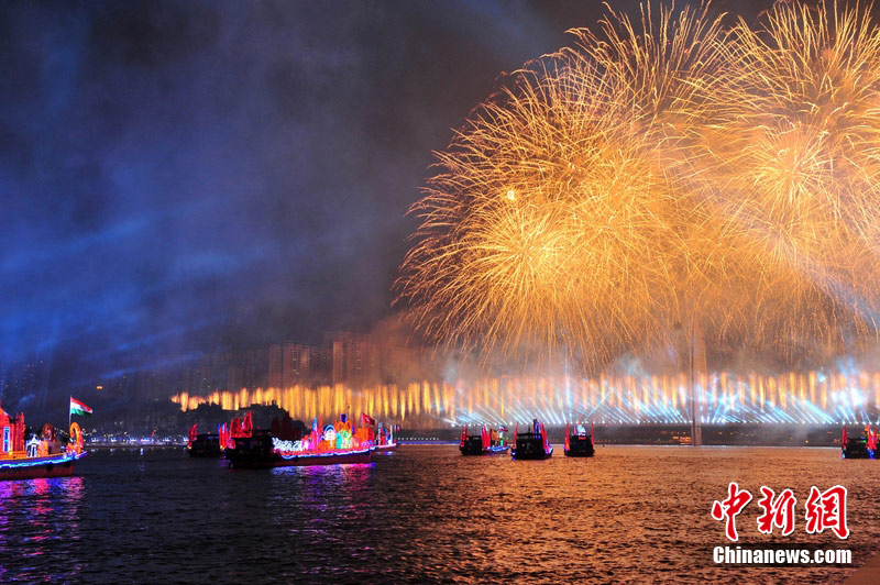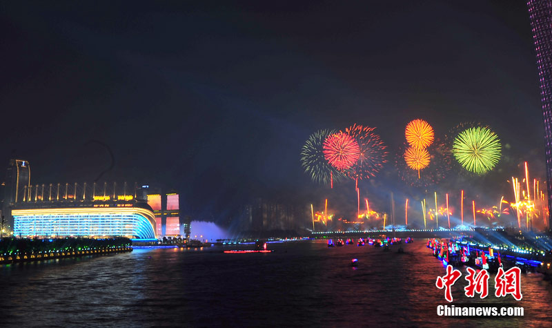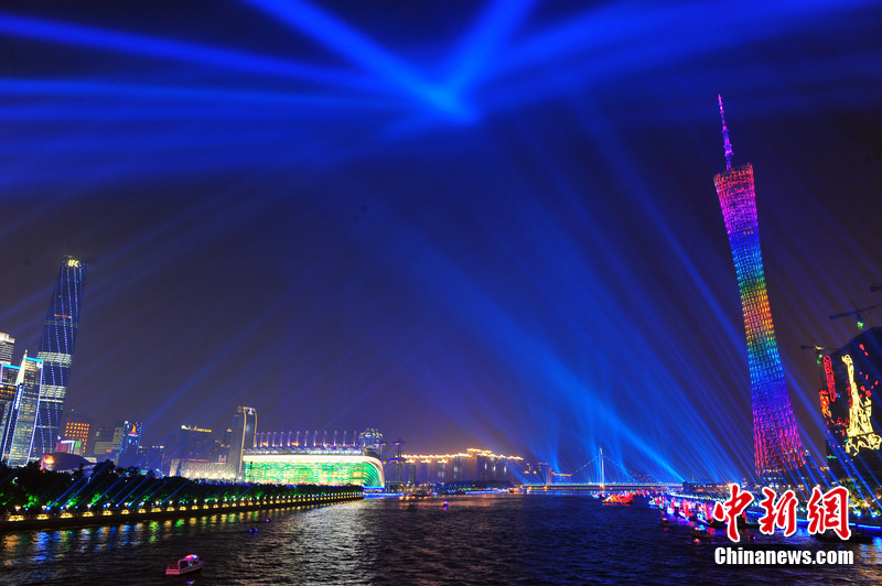 2010年11月3日晚,廣州海心沙上演包括煙花預演在內(nèi)的亞運開幕式帶妝彩排。圖片來源:CFP視覺中國