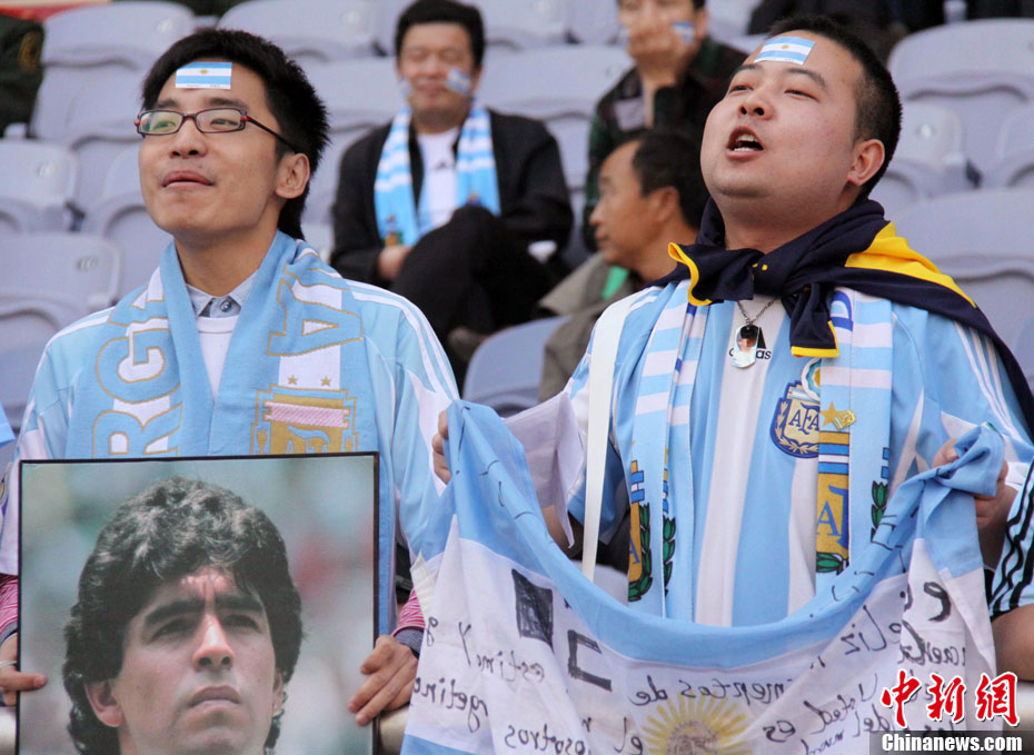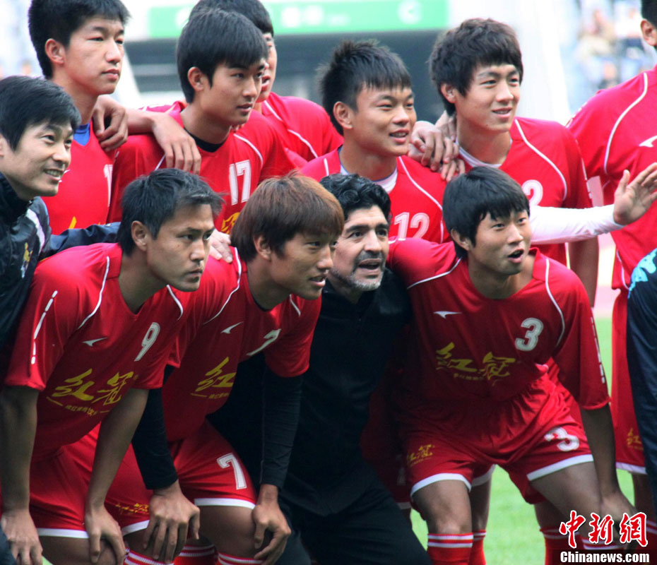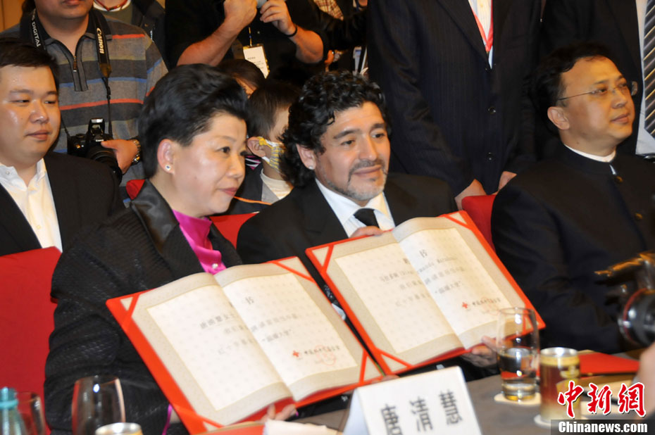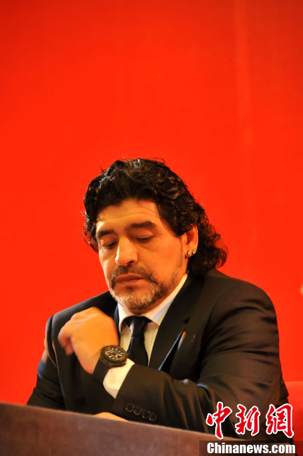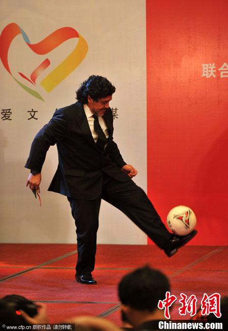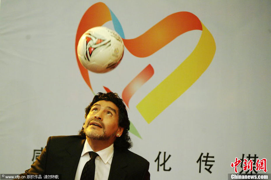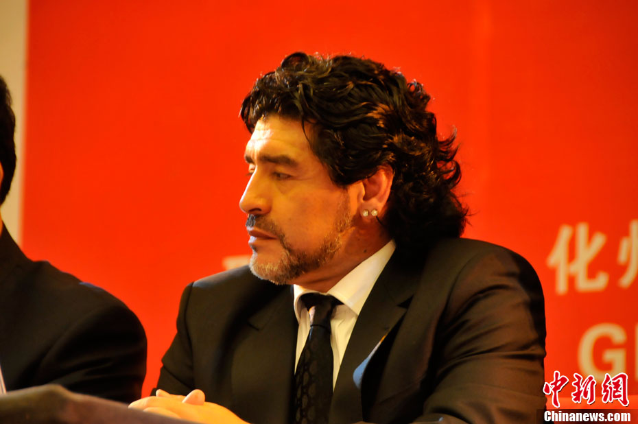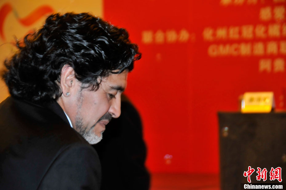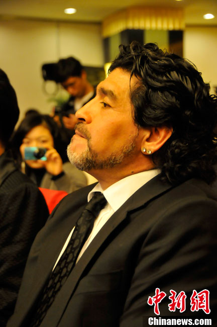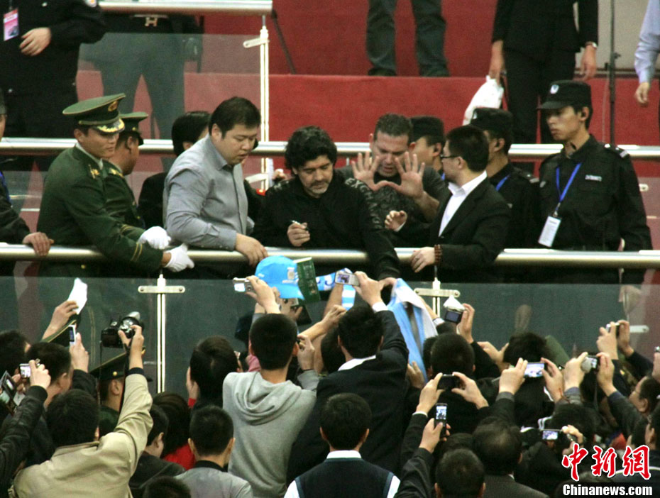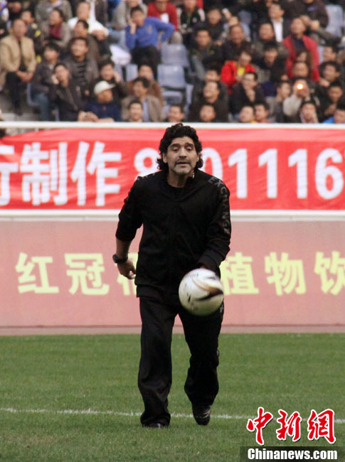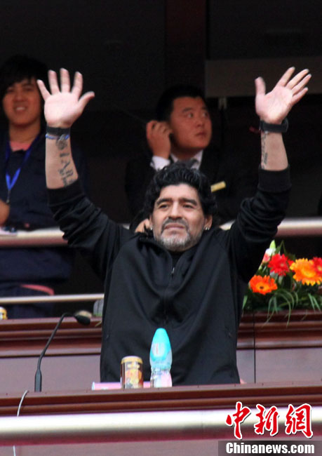 11月5日下午16時左右,世界球王馬拉多納來到山東濟南奧體中心參加山東聯隊與阿根廷明星隊的慈善比賽。圖為馬拉多納向現場的觀眾和球迷揮手致意。中新社發 牛杰峰 攝