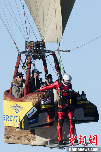 當地時間2010年11月5日,瑞士貝爾謝“火箭人”伊夫-羅西使用裝有小型噴氣發動機的噴氣動力翼,首次完成空中翻轉特技。