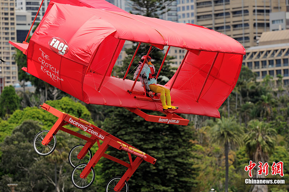 11月7日,在澳大利亞悉尼舉行了搞笑的紅牛杯“鳥人”大賽。據報道,這項賽事1991年起源于奧地利維也納,參賽選手自制人力飛行器從高臺起飛并最終躍入水中,飛行距離最遠者獲勝。