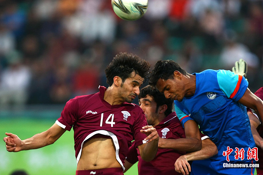11月9日,第16屆亞運會男足比賽展開D組的一場爭奪,上屆亞運會冠軍卡塔爾隊(紅)在先失一球的情況下實現逆轉,最終以2:1戰勝印度隊。中新社記者 富田 攝