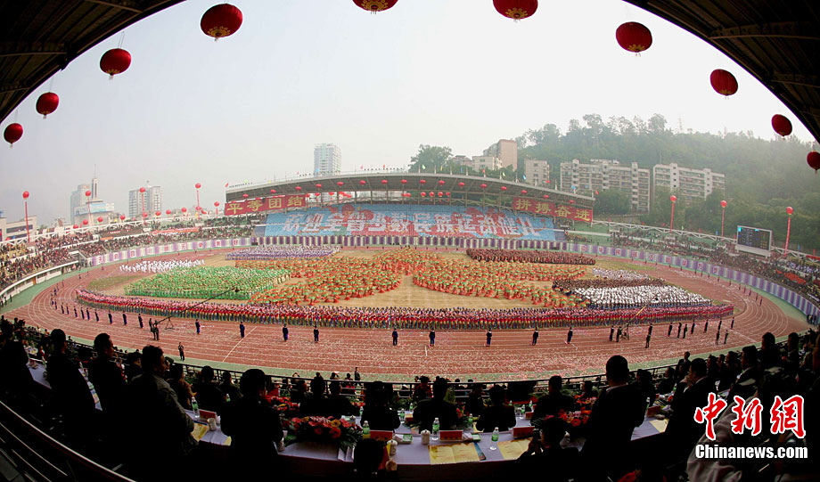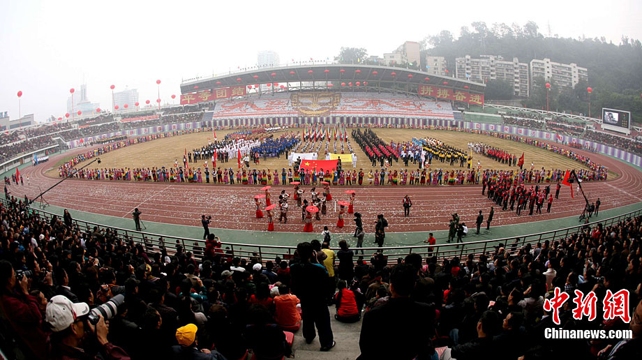 11月10日,四川省第13屆少數民族體育運動會在攀枝花拉開帷幕。來自涼山州、甘孜州、阿壩州、樂山市、雅安市等10個市州以及西南民族大學、成都體育學院共12支代表隊1066名運動員,將參加陀螺、民族式摔跤、田徑等9個競賽項目7天的比賽。本次運動會是四川歷屆少數民族運動會規模最大的一次,所有項目均可免費觀看。中新社發 劉忠俊 攝