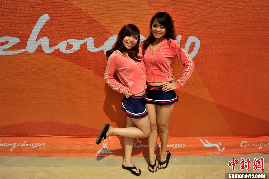 11月11日,熱情洋溢的“沙灘寶貝”身著比基尼在廣州亞運會沙灘排球館主賽場進行訓練。比賽期間,沙灘排球場將有4支啦啦隊進行現場表演。中新社記者 金碩 攝