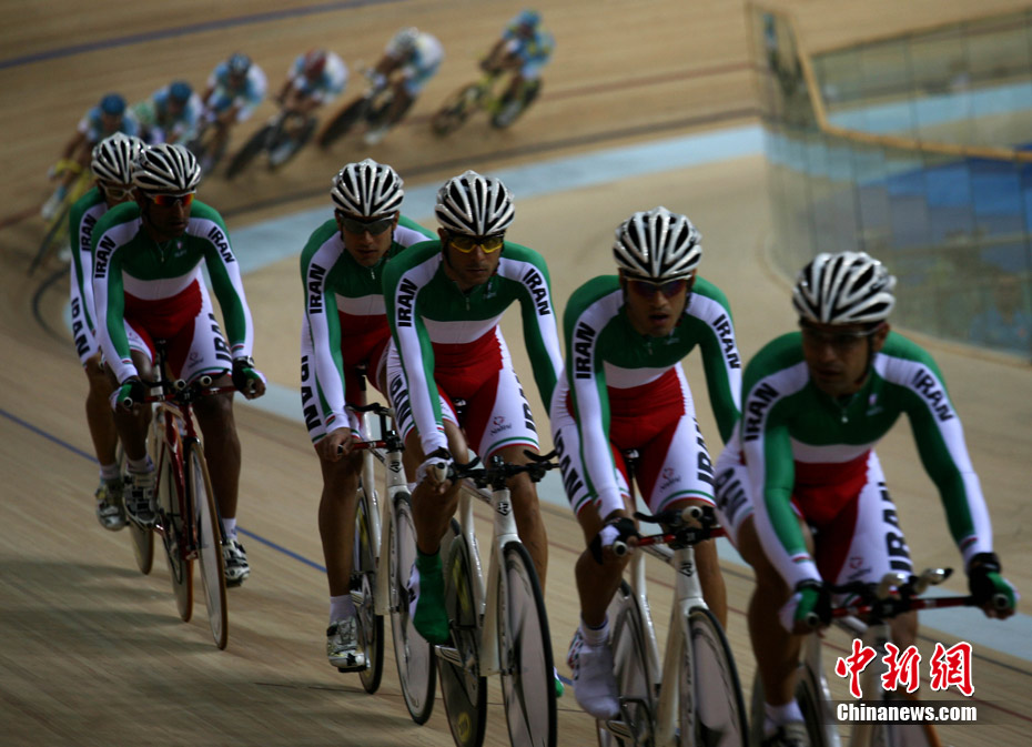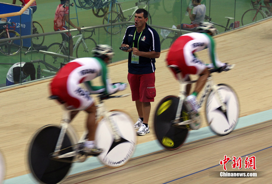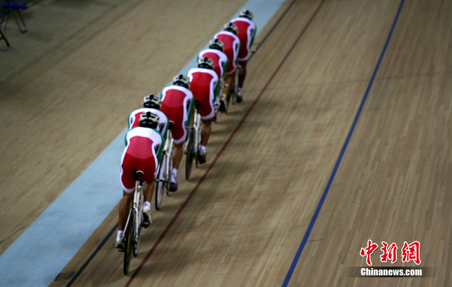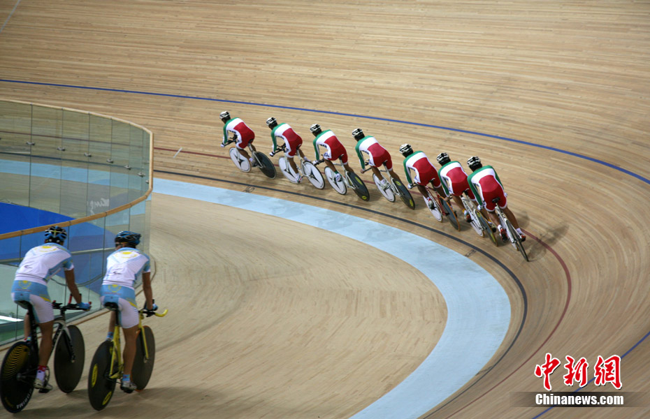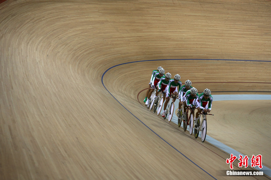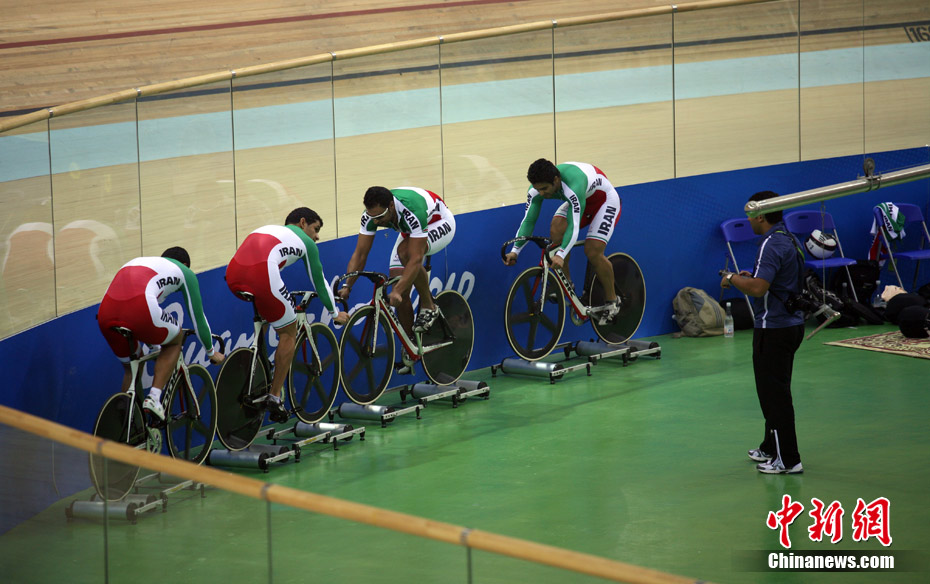 11月11日,廣州自行車輪滑極限運動中心內,來自伊朗、韓國、中國香港等國家和地區的自行車運動員進行賽前場地適應訓練。中新社記者 張茵 攝