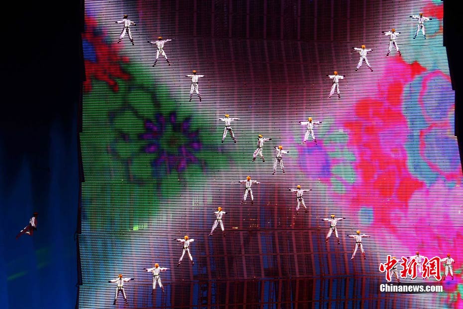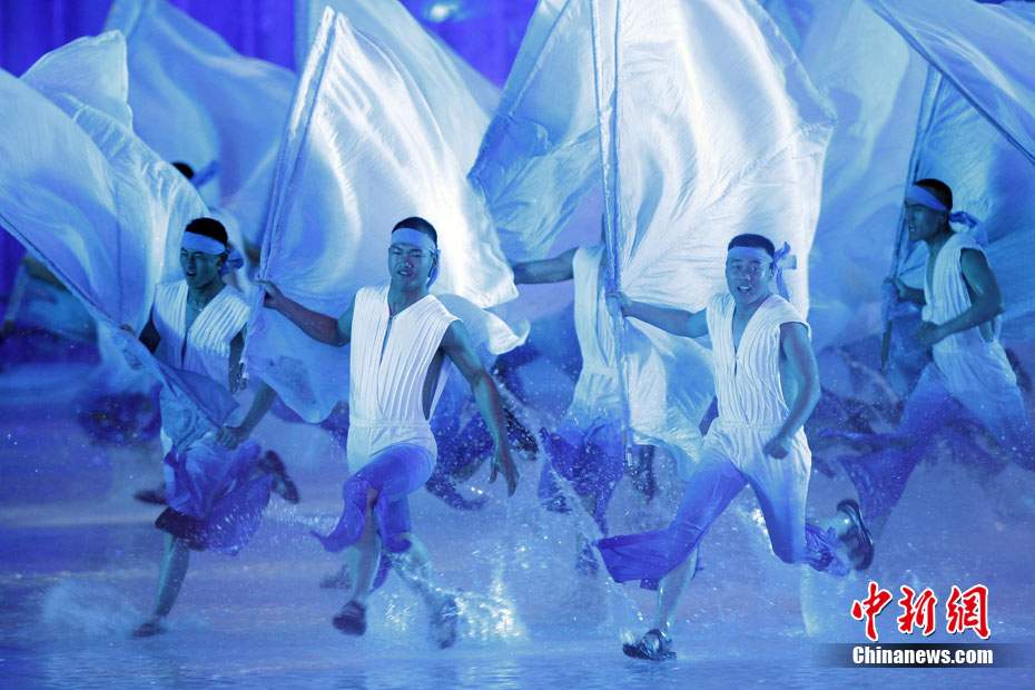 11月12日晚,第16屆亞運會開幕式在廣州海心沙舉行,宏大、絢麗的文藝匯演《啟航》給亞洲以及世界觀眾帶來藝術盛宴。水是廣州亞運開幕式最主要的創意元素,幕式的表演從一滴水到汪洋大海,從一葉扁舟到巨型帆船,從一汪情水到滔天巨浪。演員們用各種表演手段盡情展現水的魅力,表達水是生命之源、滋養萬物、呵護人類文明的精神內涵,令人嘆為觀止。中新社記者 杜洋 攝