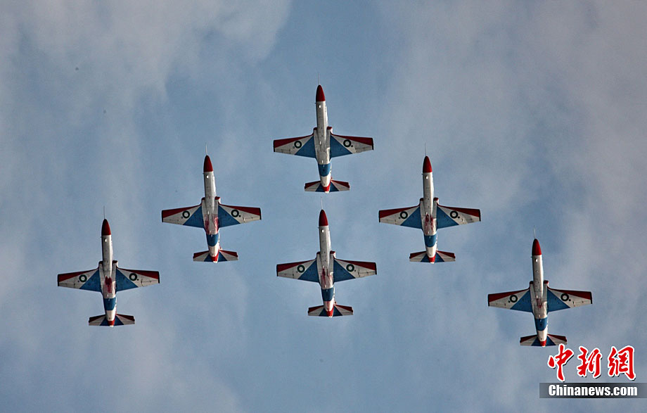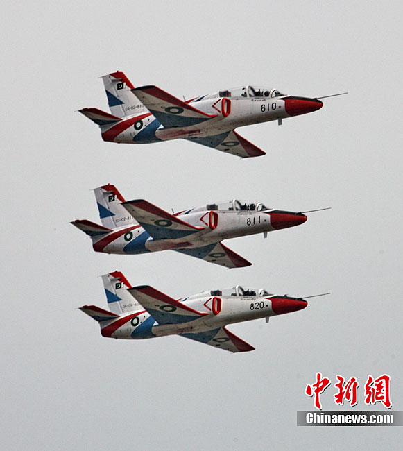 11月13日下午,巴基斯坦空軍“雄獅”飛行表演隊的飛行員駕駛k8教練機進行九機密集隊形飛行訓練。昨日,巴基斯坦空軍“雄獅”飛行表演隊抵達珠海,這支表演隊由10架K8教練機和一架C130運輸保障機組成。由外國飛行員駕駛“中國造”飛機在中國航展上表演,必將是一道優美而又特別的風景。圖為巴基斯坦空軍“雄獅”飛行表演隊的飛行員駕駛k8教練機進行九機密集隊形飛行訓練。圖片來源:CNSPHOTO 喬天富 攝
