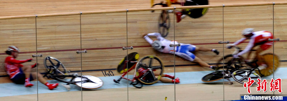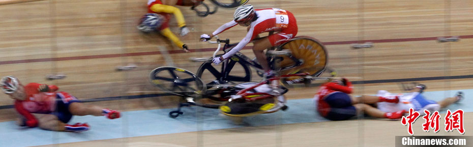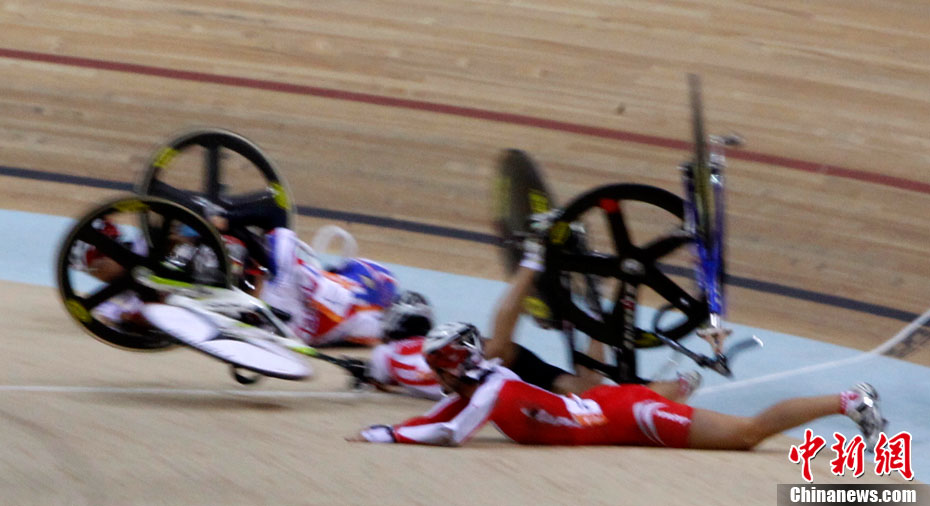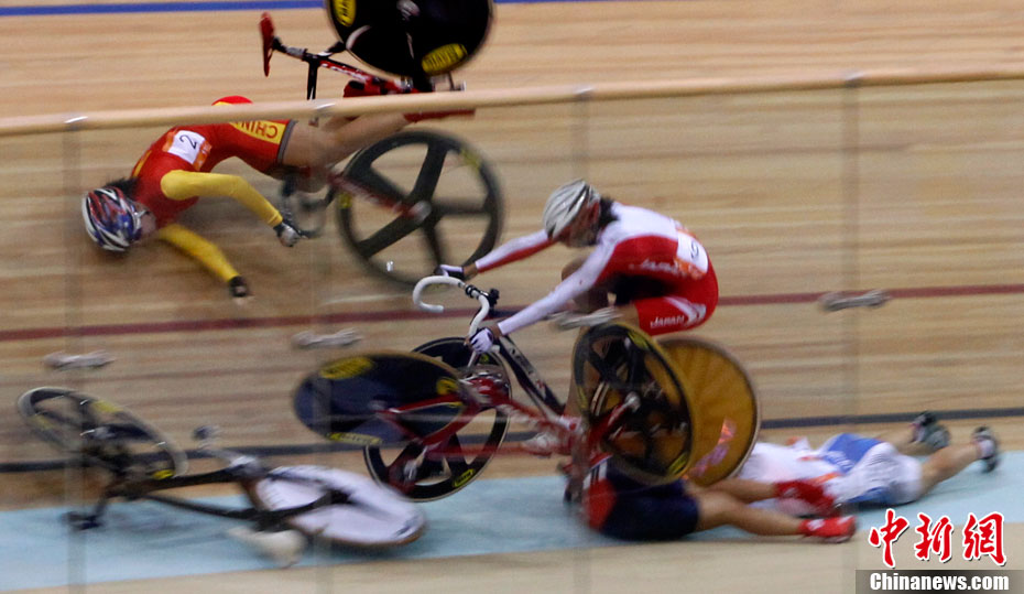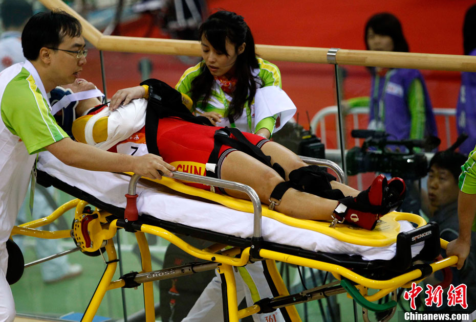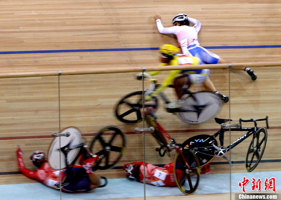 11月16日,廣州亞運會自行車比賽進入第四天,在女子積分賽比賽的最后沖刺階段,突發(fā)嚴重車禍,七位比賽選手均翻車倒地被送往醫(yī)院救治。其中中國的湯科蓉傷勢最為嚴重,被送往醫(yī)院急救。中新社記者 趙振清 攝