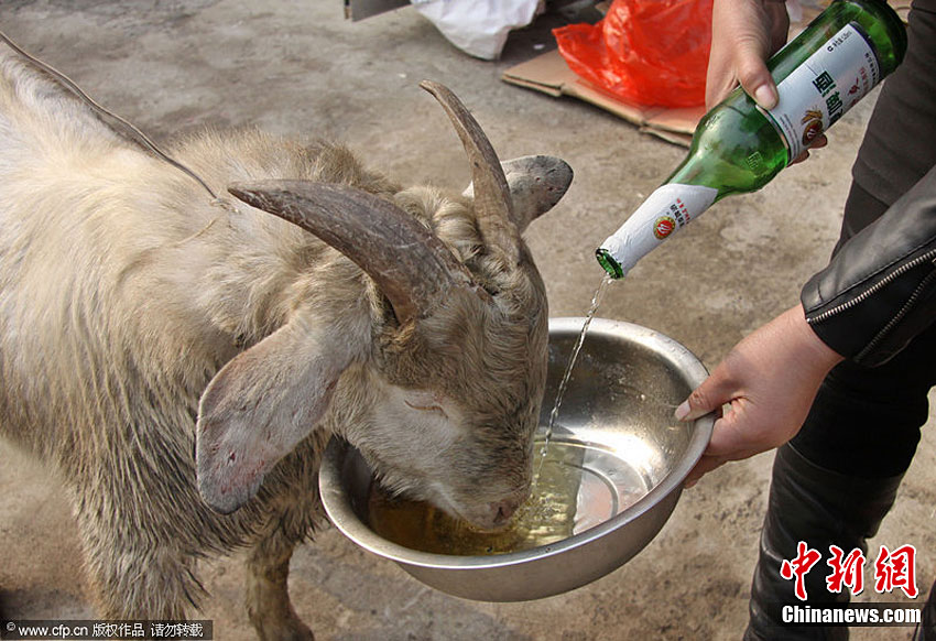 11月29日,在山東省臨沂市羅莊區盛莊街道,“酒鬼山羊”在大口喝酒。據悉,臨沂市羅莊區盛莊街道亓女士家養了一只波爾山羊,平時和狗拴在一起,經常用酒店的剩飯菜喂狗,兩個月前,亓女士發現這只山羊開始和狗爭食吃,雞魚肉蛋樣樣品嘗,看熱鬧的村民試著用酒喂食,沒想這只山羊對啤酒和白酒來者不拒,而且酒后還撒潑到處頂撞人。朱武濤 攝 圖片來源:CFP視覺中國