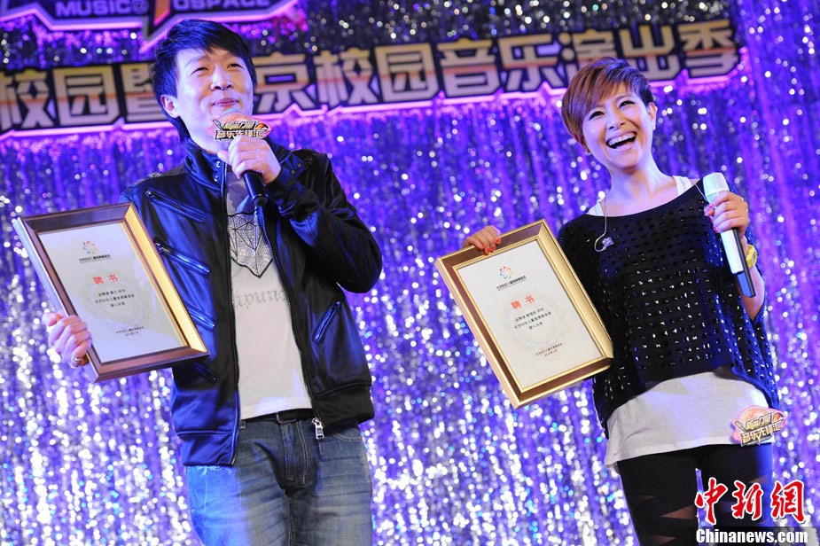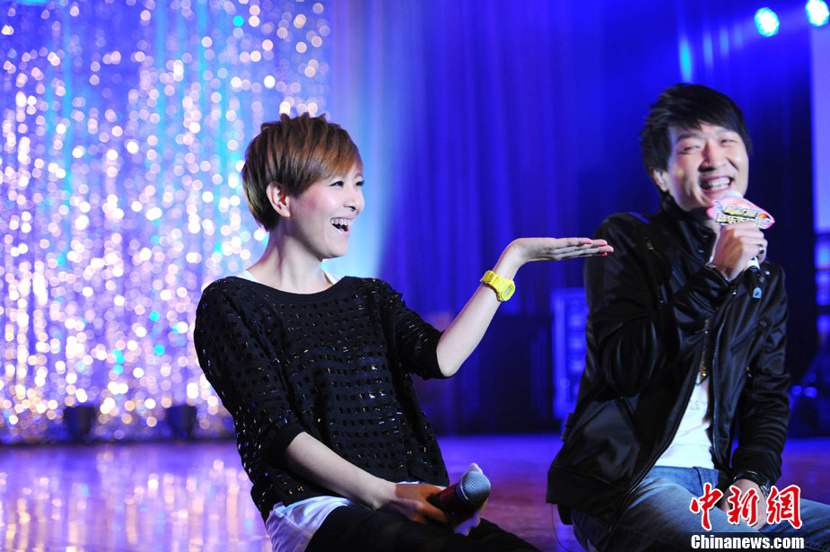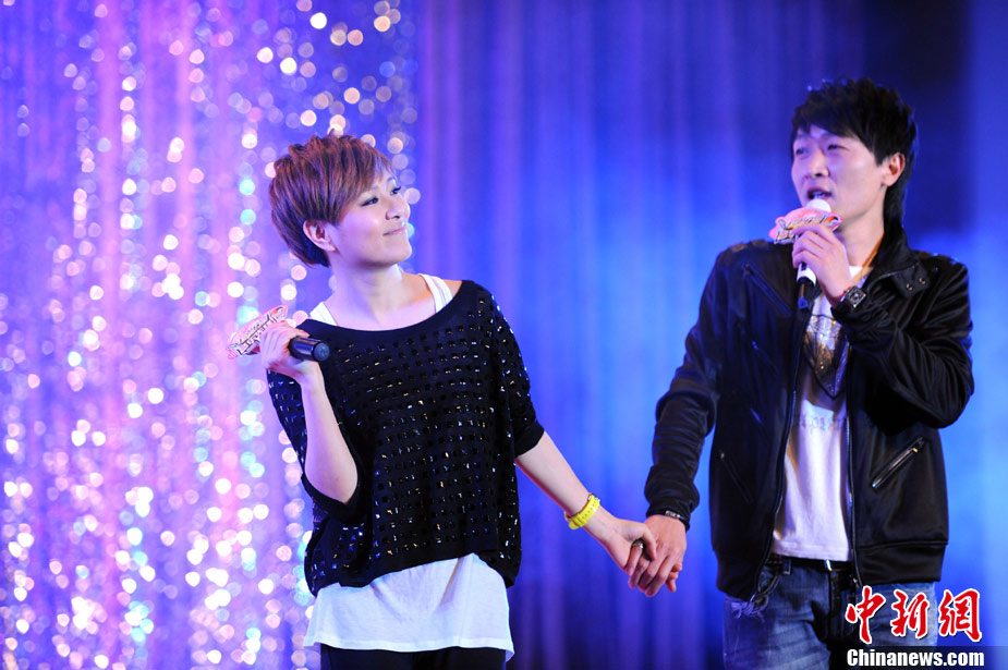 11月29日晚,2010公益進校園暨北京校園音樂演出季活動之李慧珍&樊凡主題歌友會在北京化工大學舉行,兩位歌手為歌迷們獻上了一首首經典的曲目。因演唱熱播電視劇《蝸居》主題曲爆紅的樊凡還親自譜曲了情歌《只需要一首歌》,并與李慧珍牽手甜蜜合唱。現場,積極投身愛心公益事業的樊凡和李慧珍還為貧困學生頒發了“媽媽的年夜飯”善款,并雙雙被北京婦女兒童基金會聘為“愛心大使”。圖為李慧珍、樊凡牽手獻唱。中新社記者 李學仕 攝