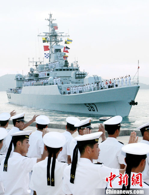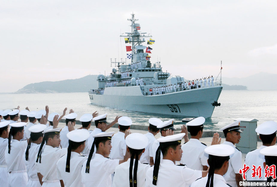 11月30日,海軍“襄樊”號導彈護衛艦,搭載艦載直升機一架,在南海艦隊某驅逐艦支隊副支隊長胡偉華大校的率領下,緩緩駛離三亞某軍港,赴北部灣參加第十次中越聯合巡邏及出訪越南峴港市的征程。此次巡邏是中國海軍護衛艦首次攜帶艦載直升機與越南海軍執行北部灣聯合巡邏任務。訪問期間,中越雙方將通過舉辦高層互訪、甲板招待會、體育比賽、參觀艦艇等活動進行友好交流。返航途中,中方出訪艦艇還將與越南海軍進行聯合搜救演練。圖為“襄樊”艦駛離母港。 中新社發 李章龍 攝