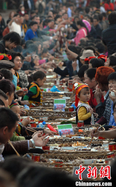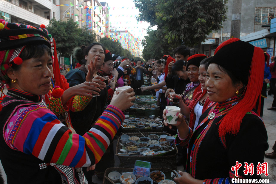 11月30日,有“天下第一宴”、“世界最長的宴席”美稱的云南綠春哈尼族長街宴于在云南綠春縣開宴,來自海內(nèi)外上萬名游客參加了今年的長街宴。此次長街宴共設(shè)1860桌全長近2000米。云南綠春哈尼長街宴于2008年以3050桌全長4000米被上海吉尼斯認(rèn)證為“世界最長的宴席”。中新社發(fā) 任東 攝