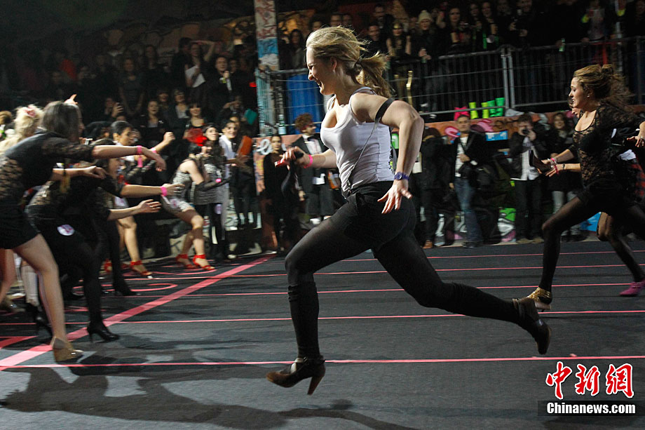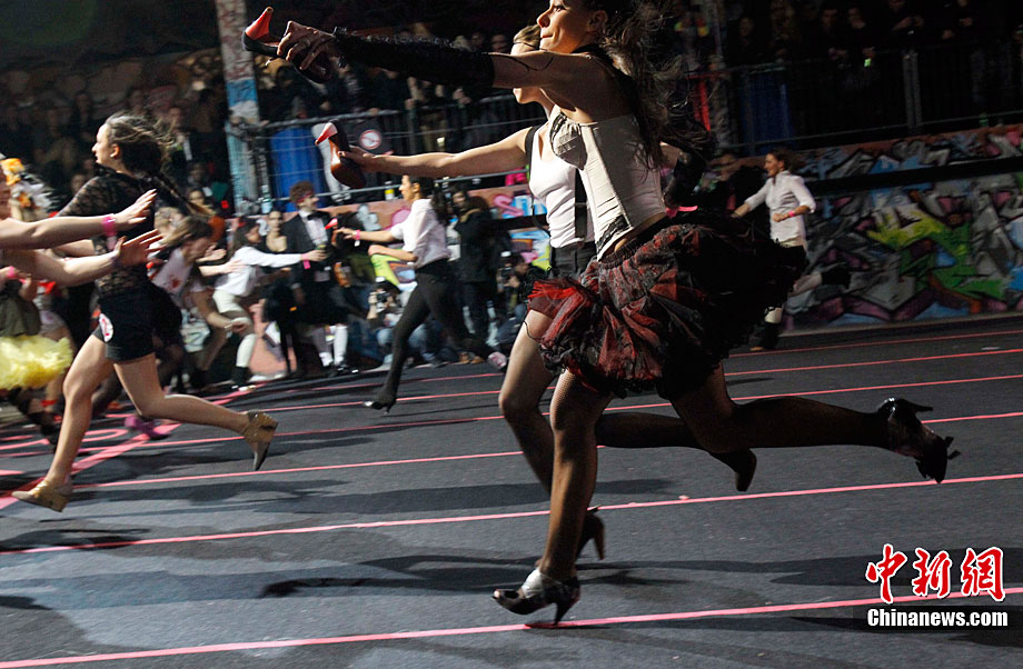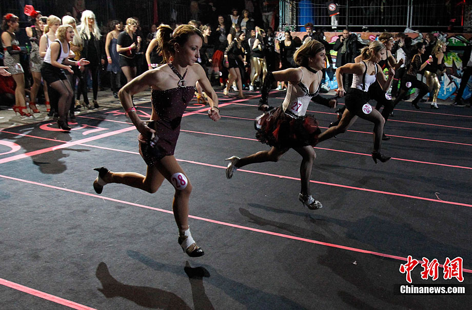 近日,第三屆Sarenza高跟鞋短跑比賽在法國巴黎舉行。來自法國和英國的選手參加了3×60米接力比賽。據悉,要想參加這項趣味比賽,參賽者所穿的高跟鞋不得低于8厘米。