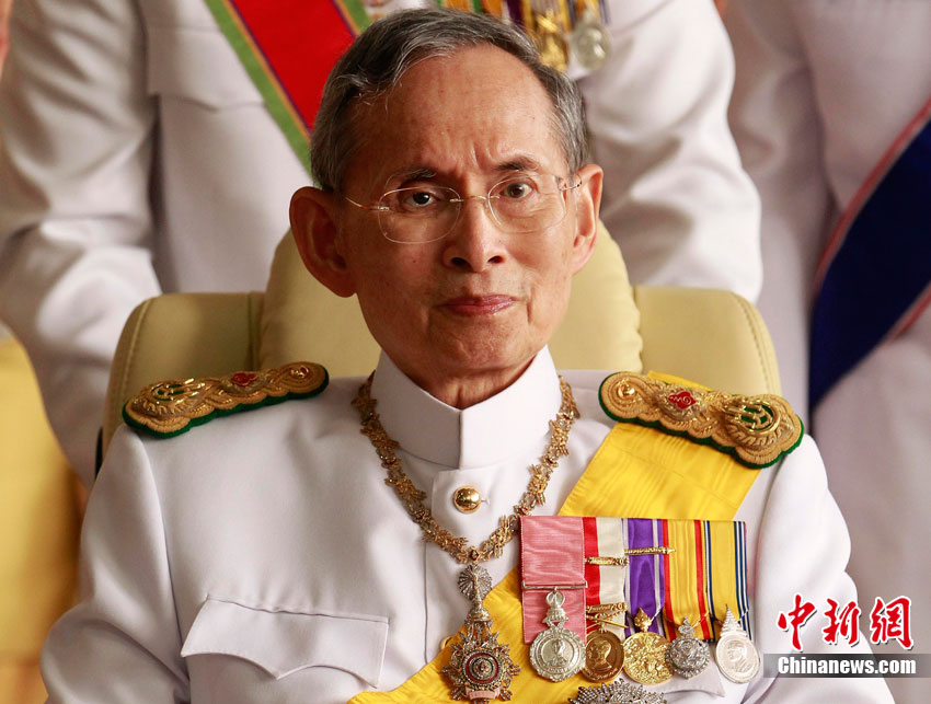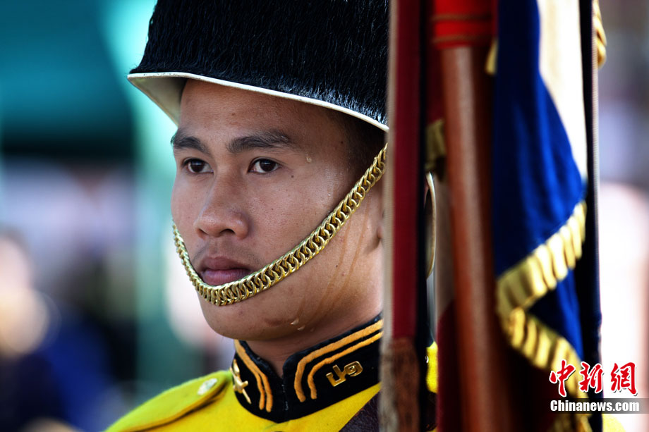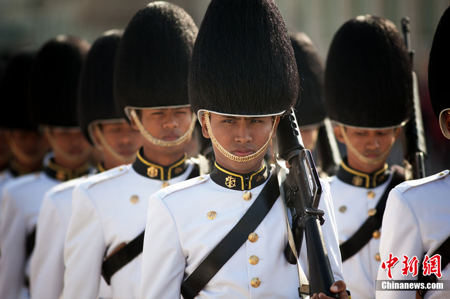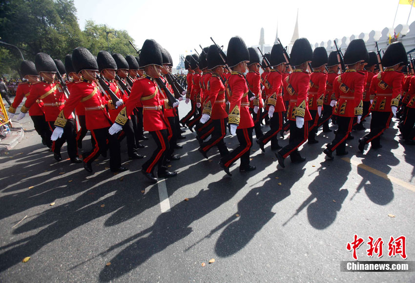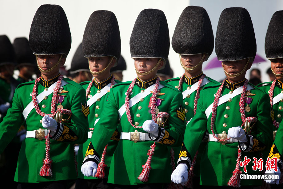 當地時間12月5日,泰國各界齊聚曼谷市中心的大王宮,慶祝泰王普密蓬83歲大壽。泰國皇家衛隊士兵身著紅、綠、黑、蘭等各種顏色的軍服進行游行,為泰王慶祝生日。