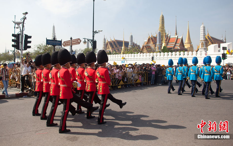 泰國皇家衛隊士兵著彩裝游行為國王慶生