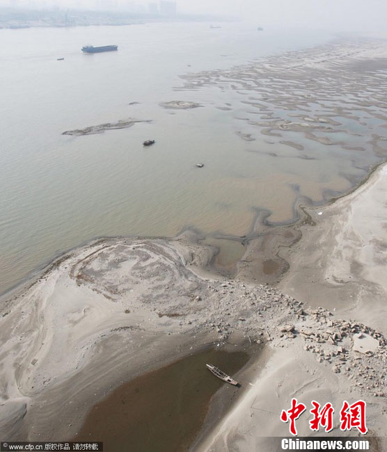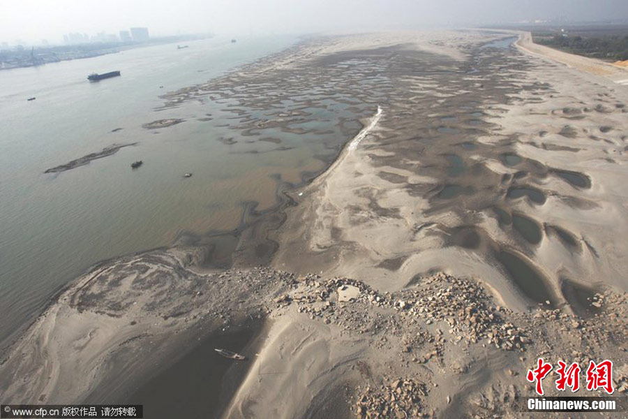 12月7日,在長江武漢市天興洲水域,大量沙洲露出江面,形成大大小小的沙丘,分布在水岸。據悉,近期,由于長江中下游地區持續多日的干燥少雨的天氣,長江漢口水位接近枯水期的標植。金思柳 攝 圖片來源:CFP視覺中國