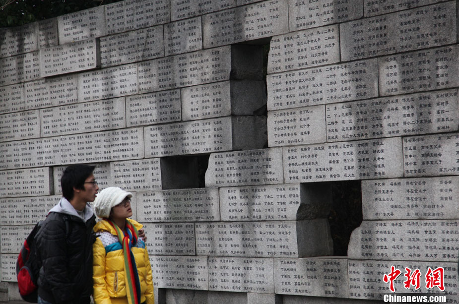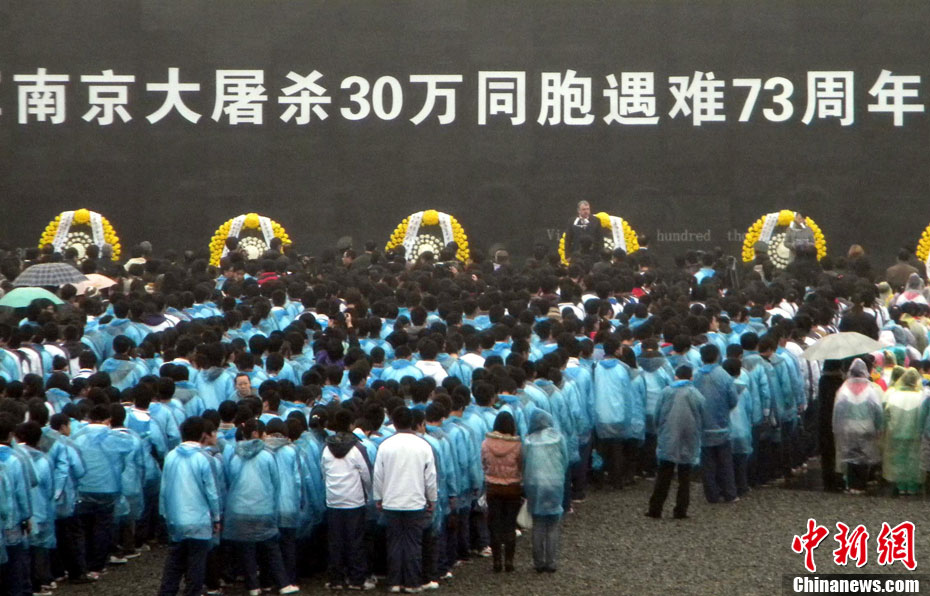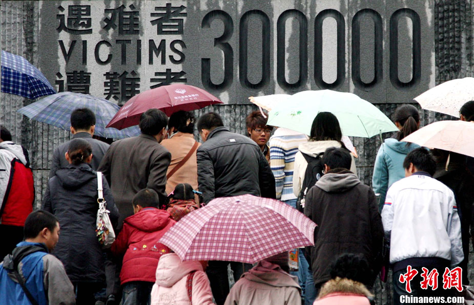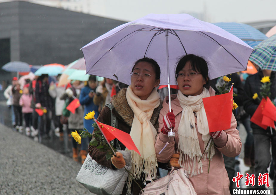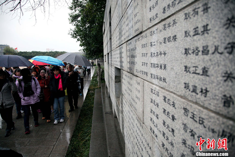12月13日是南京大屠殺遇難同胞73周年祭日,12日起,江蘇南京將舉行和平集會、和平法會等系列活動,悼念30萬遇難同胞。圖為南京市民12日冒雨前往南京大屠殺遇難同胞紀念館悼念。 鐘山 攝 圖片來源:CNSPHOTO