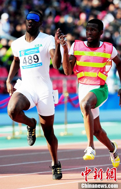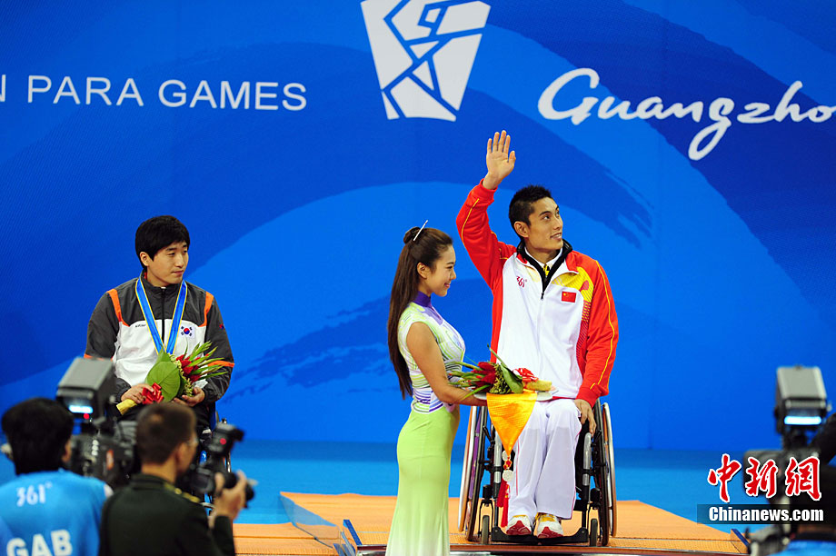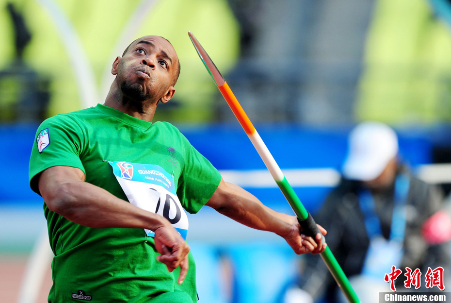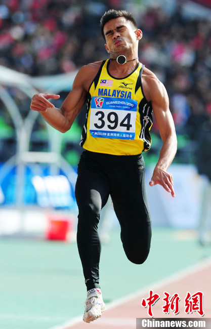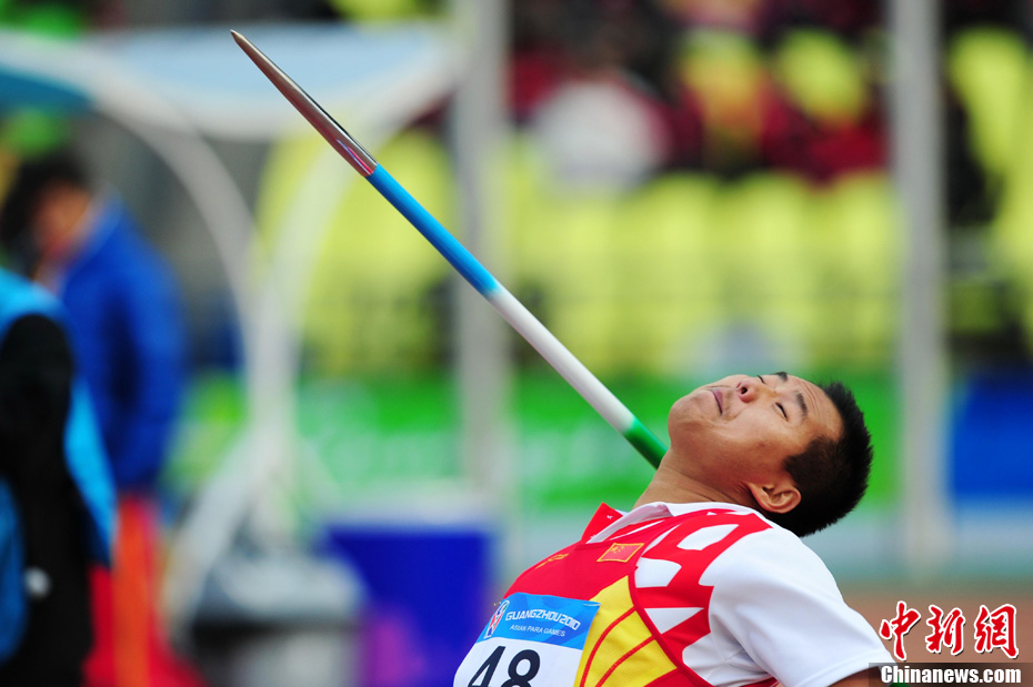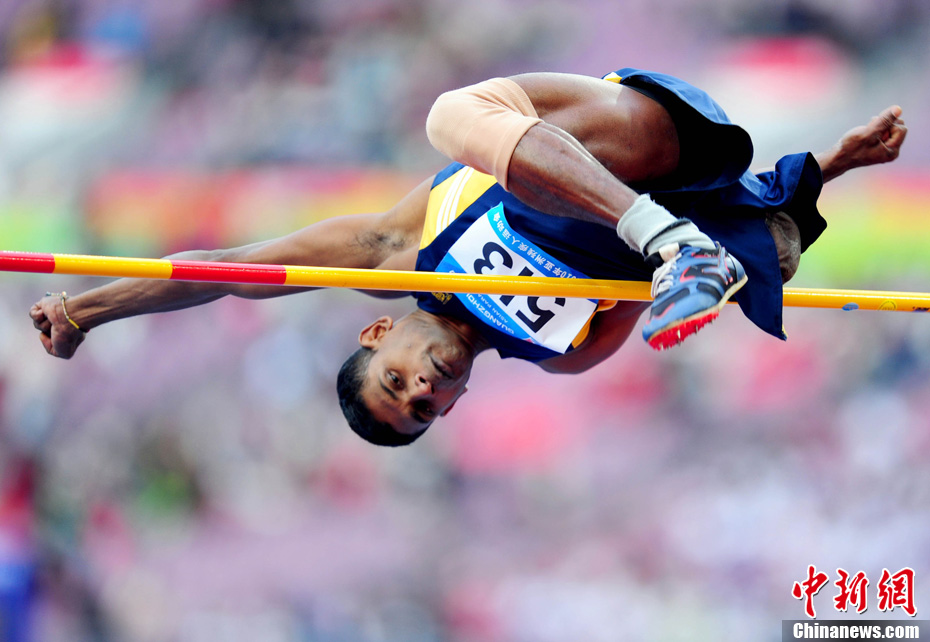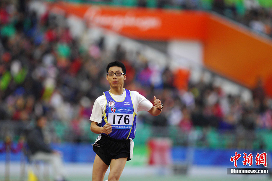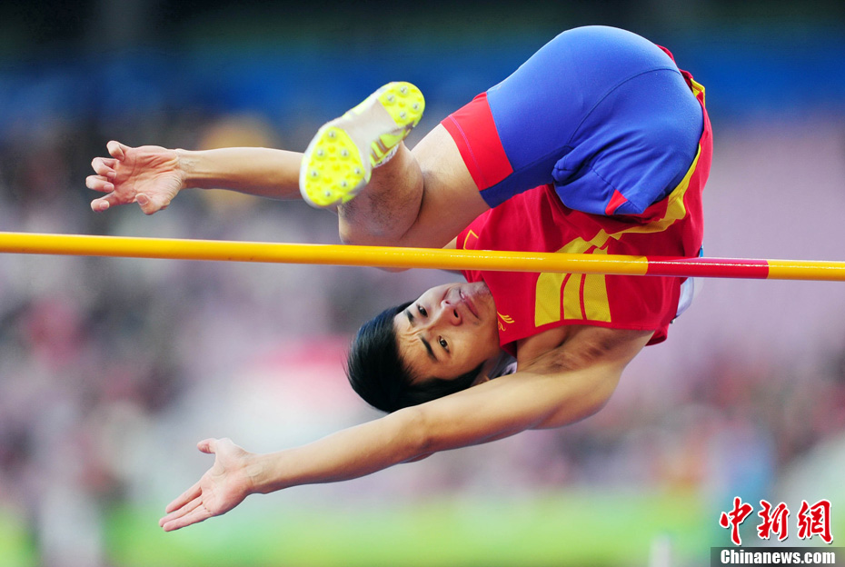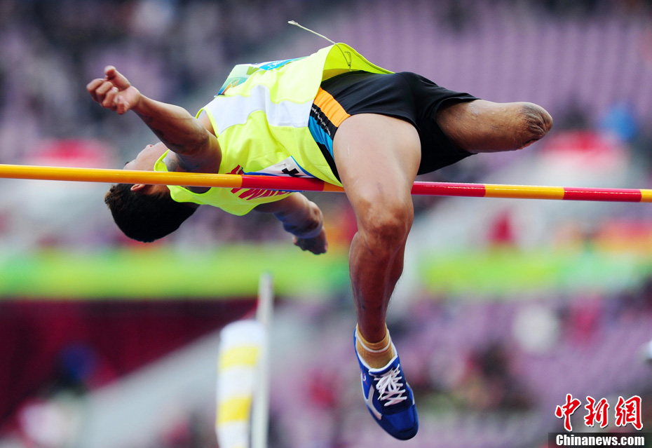 12月16日,廣州2010年亞殘運會田徑賽進入第3天,廣州遭遇寒流來襲氣溫降到最低2度,最高氣溫僅7度,亞洲選手在寒冷的氣候條件下參賽。圖為中國跳高選手李小文在比賽中。中新社記者 陳文 攝