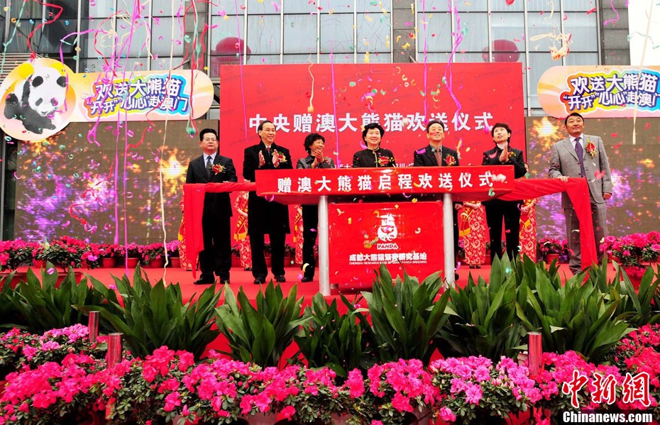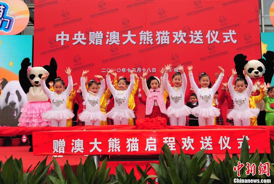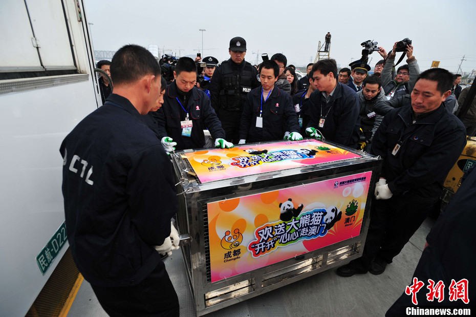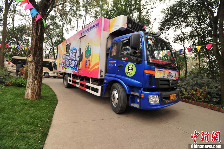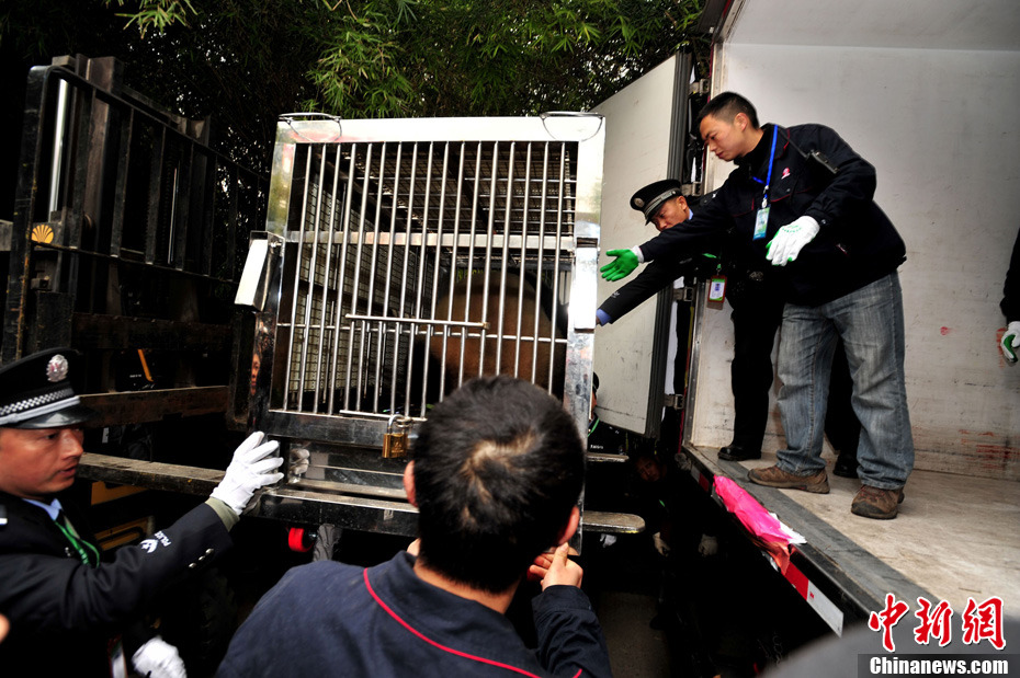 12月18日上午,中央贈(zèng)澳大熊貓歡送儀式在成都大熊貓繁育研究基地的科學(xué)探秘館廣場舉行。儀式后,工作人員將裝運(yùn)“開開”、“心心”的專用籠子搬上專車,開離成都大熊貓繁育研究基地,赴成都雙流國際機(jī)場。中新社發(fā) 安源 攝