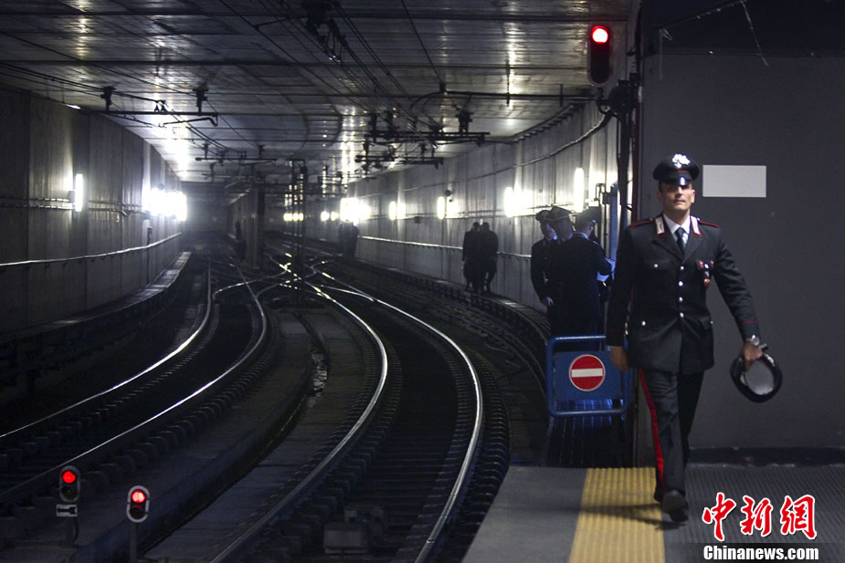 12月21日,意大利羅馬,運輸員工當天在一節地鐵空車廂里發現了一個裝有將要爆炸的炸彈包裹,隨后被安全人員拆除。圖為21日,在意大利羅馬,一輛地鐵即將到站。