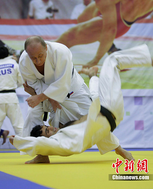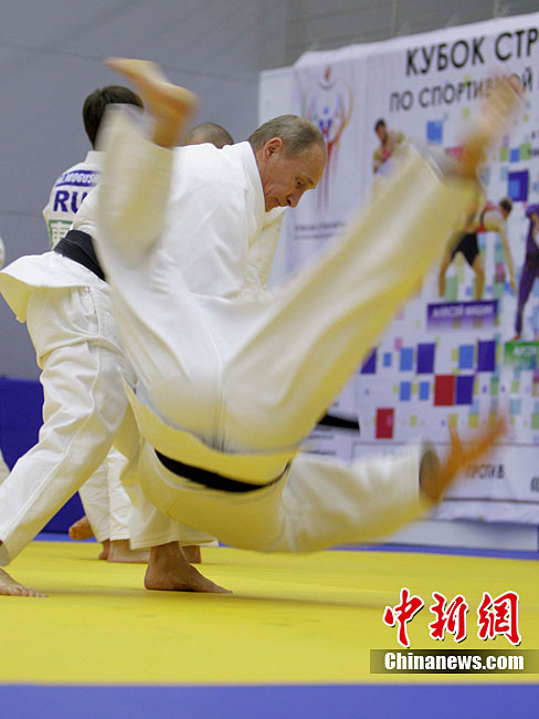 當地時間12月22日,俄羅斯總理普京來到圣彼得堡視察了一家柔道俱樂部,并參加了該俱樂部內的一堂柔道訓練課。圖為普京正在與運動員切磋柔道。