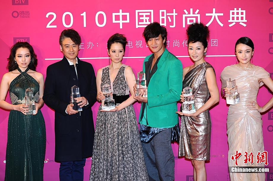 12月22日晚,由北京電視臺和時尚傳媒集團聯合主辦的2010中國時尚大典在北京精彩上演。張藝謀、黃曉明、何潤東、立威廉、翁虹、秦嵐、張靚穎、愛戴、阿朵等眾星云集讓現場星光熠熠。2010時尚大典以“時尚改變生活”為主題,精心設計并頒布了覆蓋時尚生活和時尚工業全局的18個大獎。藝術家葉錦添領軍16位中國新銳時裝設計師打造明星與名師的“跨界”時尚秀場。大典精彩鉅獻了一場集震撼視覺表達和時尚魅力呈現的饕餮盛宴。圖為阿朵和“筷子兄弟”組合,阿朵的黑色緊身衣和鹿角發型十分搶鏡。中新社記者 李學仕 攝