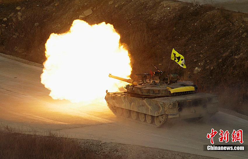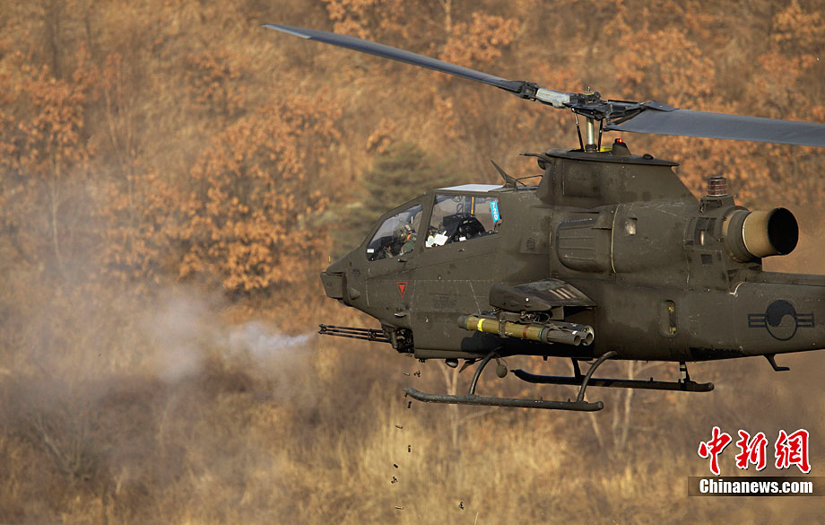 當?shù)貢r間12月23日下午2時43分,韓國軍方最大規(guī)模的陸空聯(lián)合實彈射擊演練開始。據(jù)悉,此次演習投入800名官兵,動員6架F-15K和KF-16戰(zhàn)斗機、K-1戰(zhàn)車、AH-1S攻擊型直升機、K-9自走炮、反戰(zhàn)車導彈和多管火箭發(fā)射系統(tǒng)等105種火力裝備。圖為AH-1S攻擊型直升機在進行射擊。