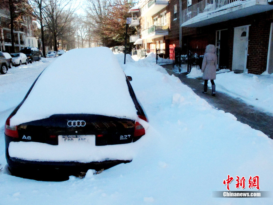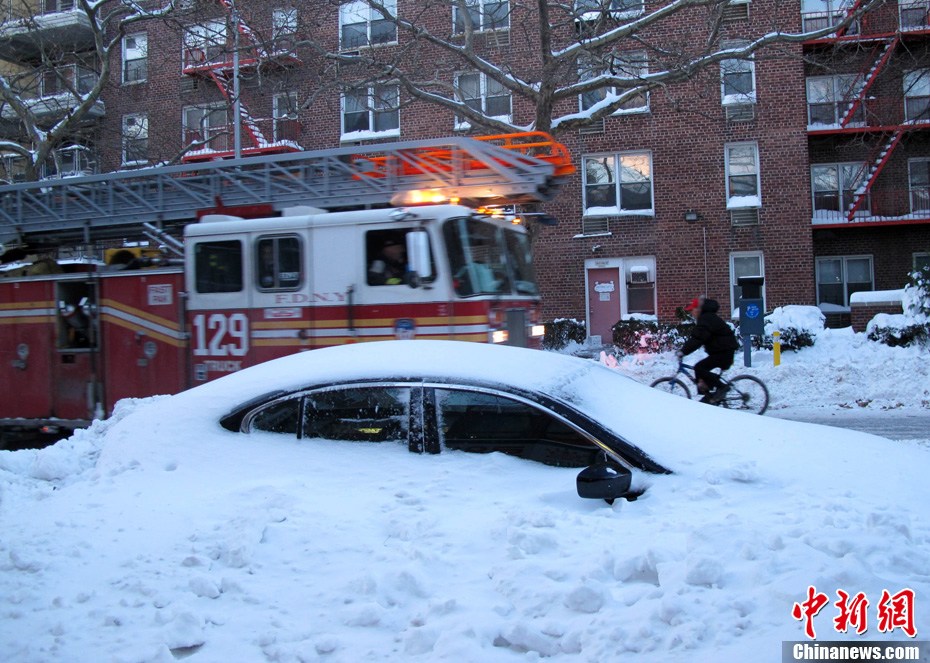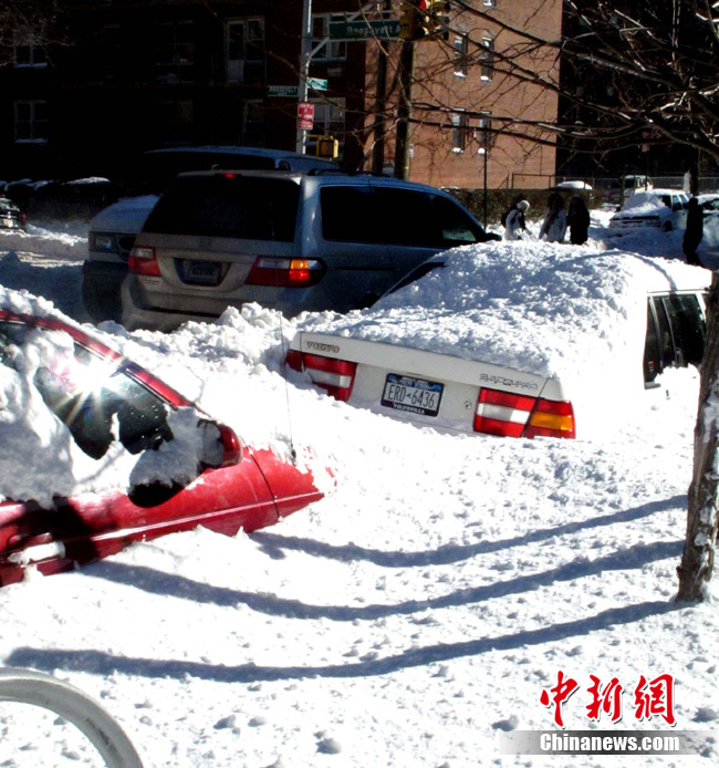2010年12月27日,美國紐約,停在路邊的車輛陷入雪堆。暴風雪26日襲擊美國東海岸,紐約市區積雪達到50厘米,全市交通陷入困境。 中新社記者 孫宇挺 攝