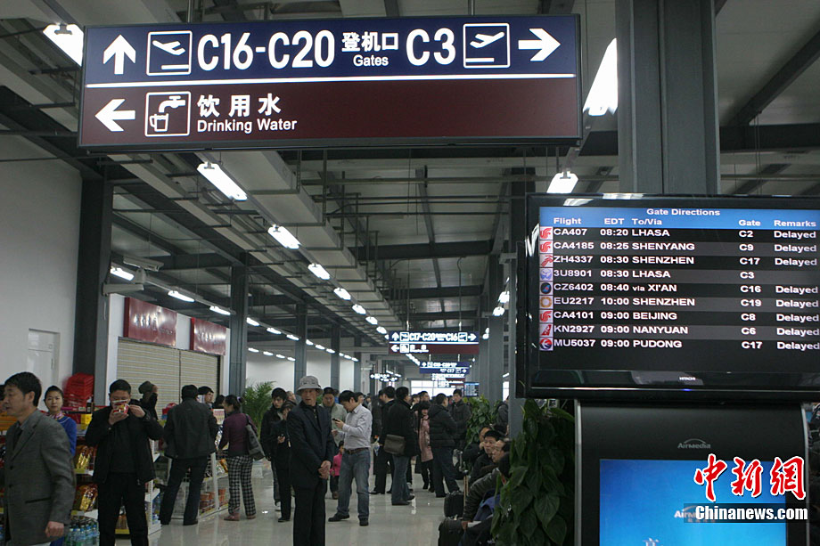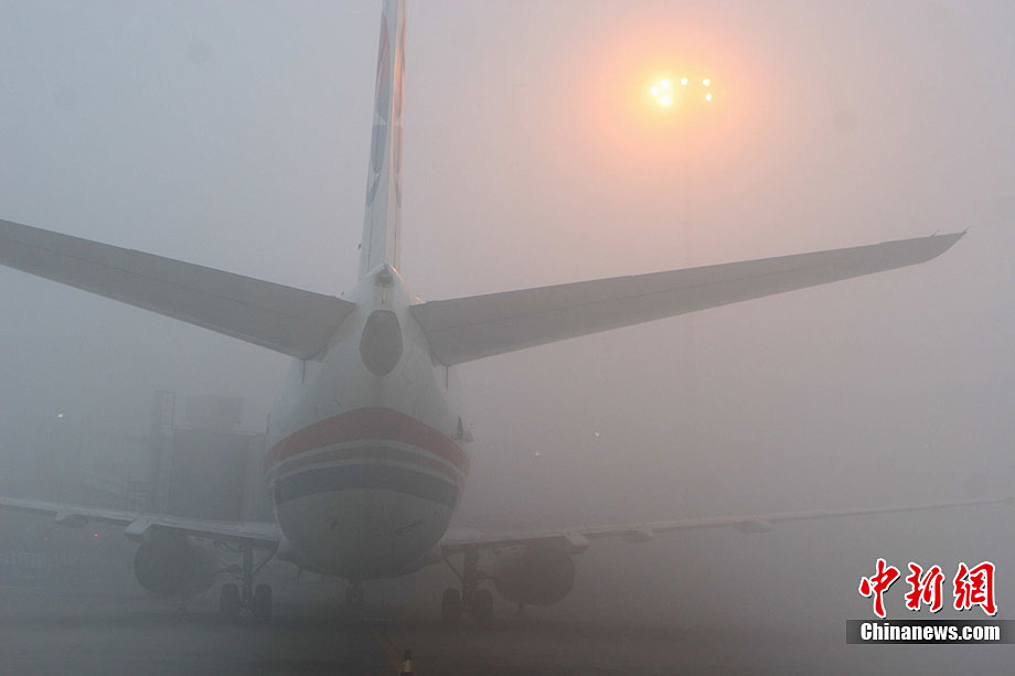 12月28日清晨3時左右,成都雙流國際機場遭遇大霧天氣襲擊。受此影響,機場被迫關閉長達7個多小時。截至11時,大霧造成110個進出港航班延誤,近萬名出行旅客被困機場。中新社發 呂俊明 攝