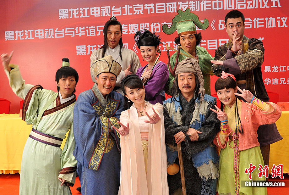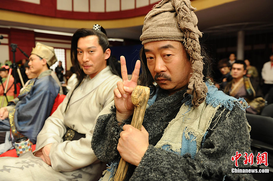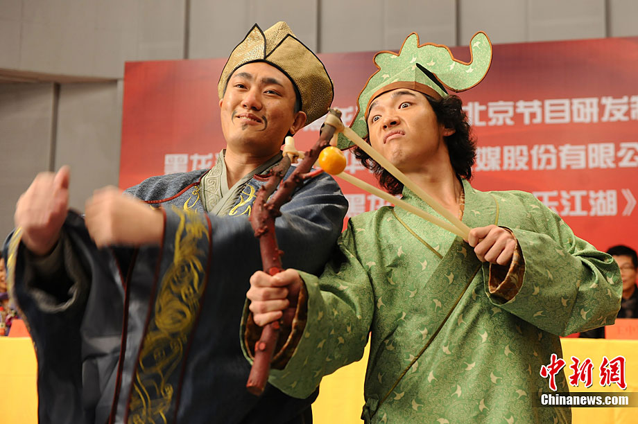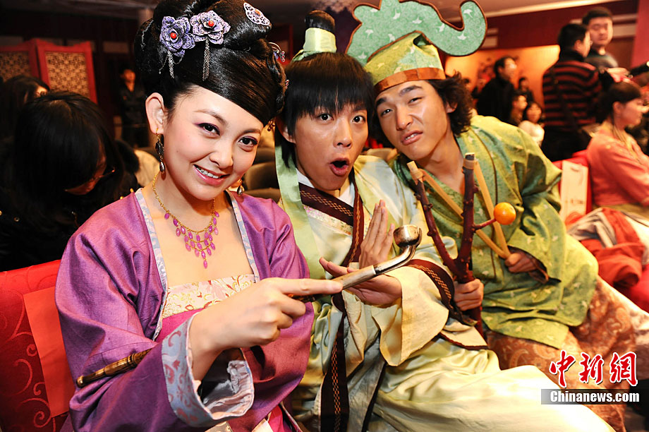 12月28日,古裝娛樂欄目劇《快樂江湖》在黑龍江電視臺北京節目研發制作中心正式開機。該劇由黑龍江電視臺與華誼兄弟聯手打造,講述了幾個現代人“穿越”到唐代的無厘頭爆笑故事。圖為劇中的“無厘頭”演員團隊。中新社記者 李學仕 攝