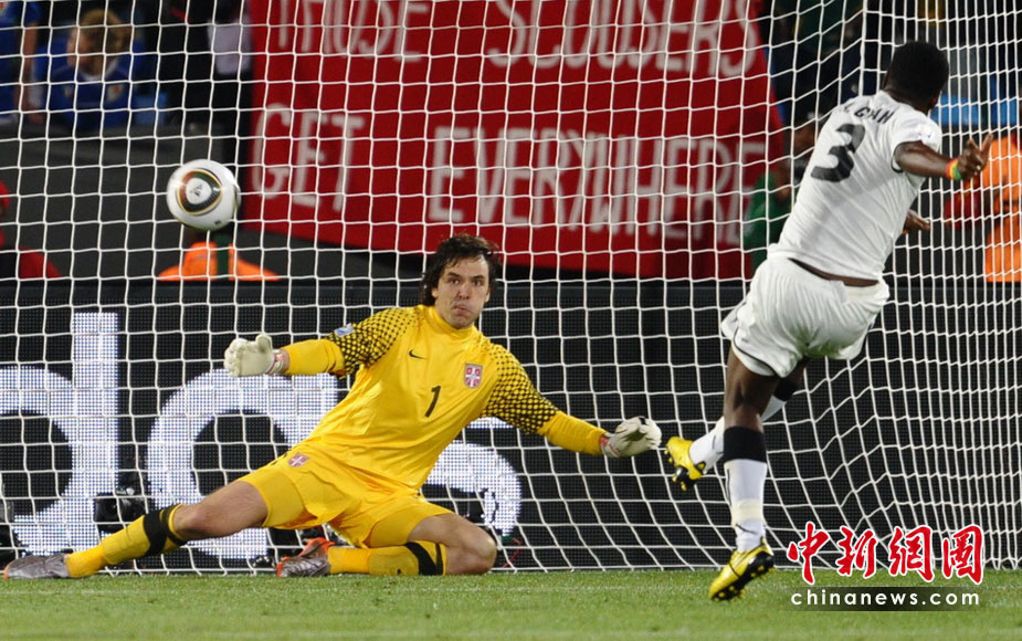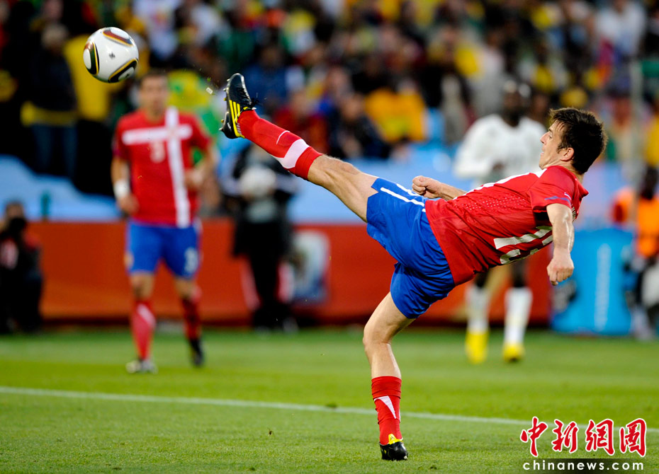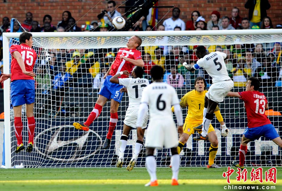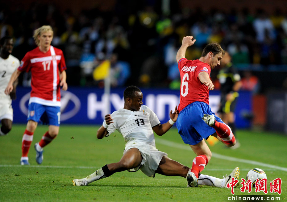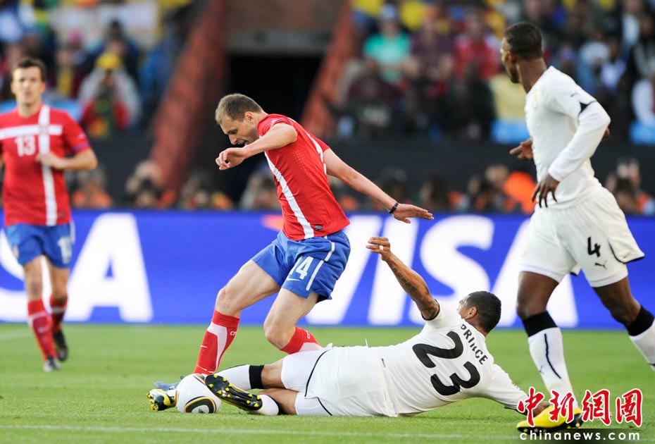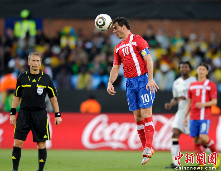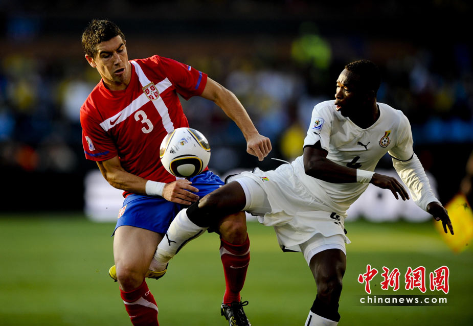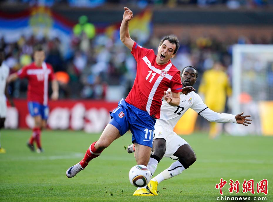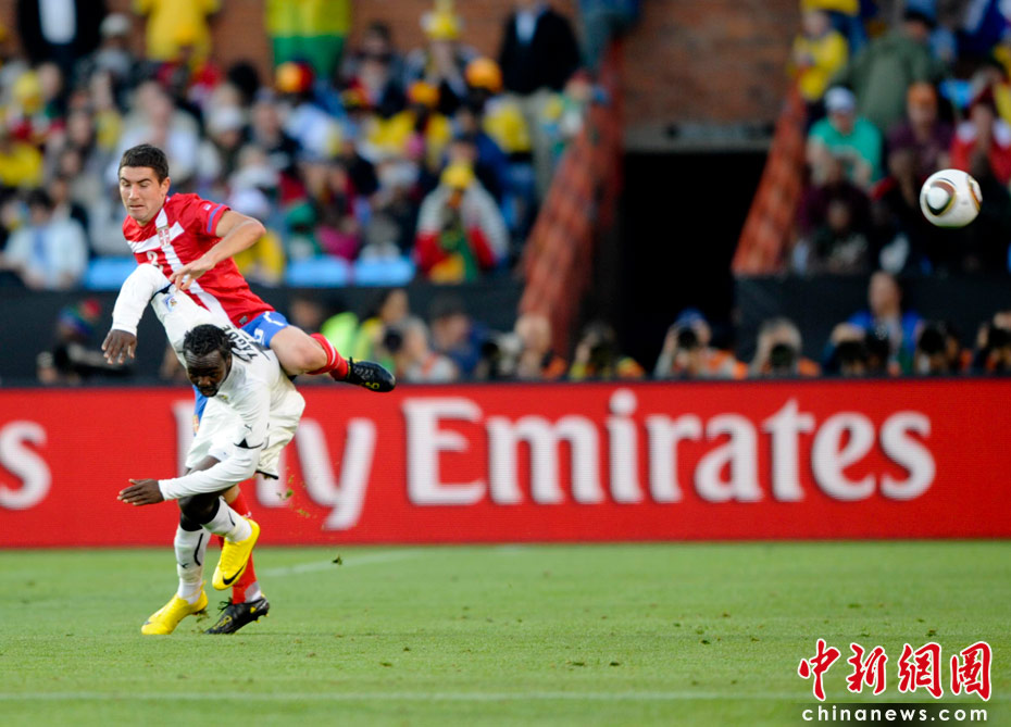 6月13日,南非世界杯D組小組賽在比勒陀利亞洛夫托斯球場舉行,在上半場比賽中塞爾維亞與加納隊展開激烈爭奪。