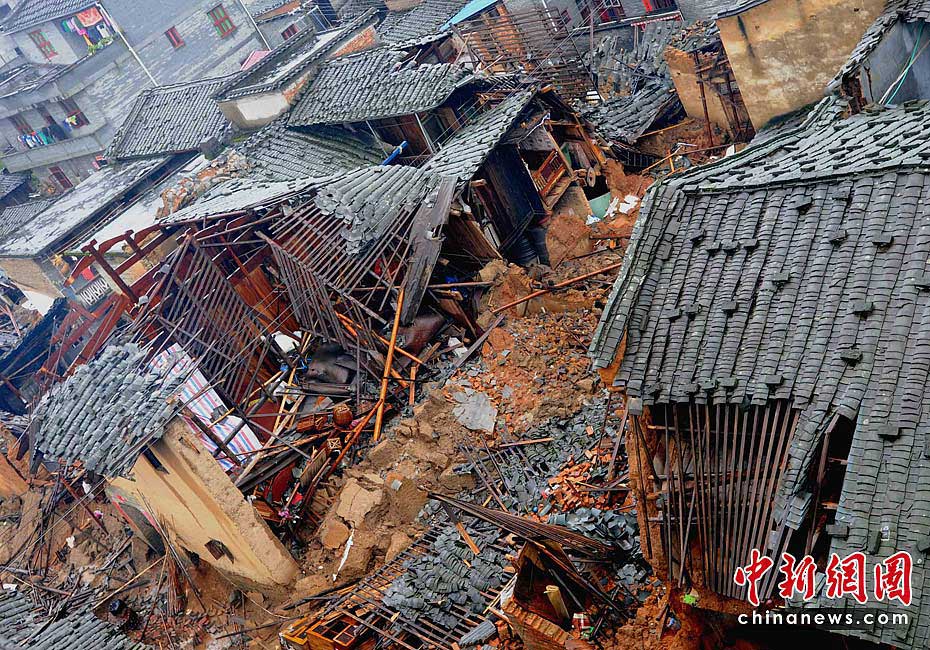 6月24日,福建建陽市童游街道新村成片倒塌的房屋,在大雨中滿目瘡痍。自6月13日以來,福建輪番遭受特大暴雨襲擊,造成了歷史罕見的自然災害。僅閩北建陽市,初步統計受災人口14.6萬人,3236間房屋倒塌,水稻、煙葉等農作物受災面積17.4萬畝,直接經濟損失4.658億元。中新社發 劉可耕 攝