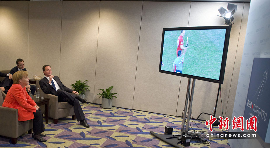 6月27日,正在加拿大參加G20領導人峰會的德國總理默克爾和英國首相卡梅倫,一同觀看了世界杯英格蘭與德國隊的比賽。