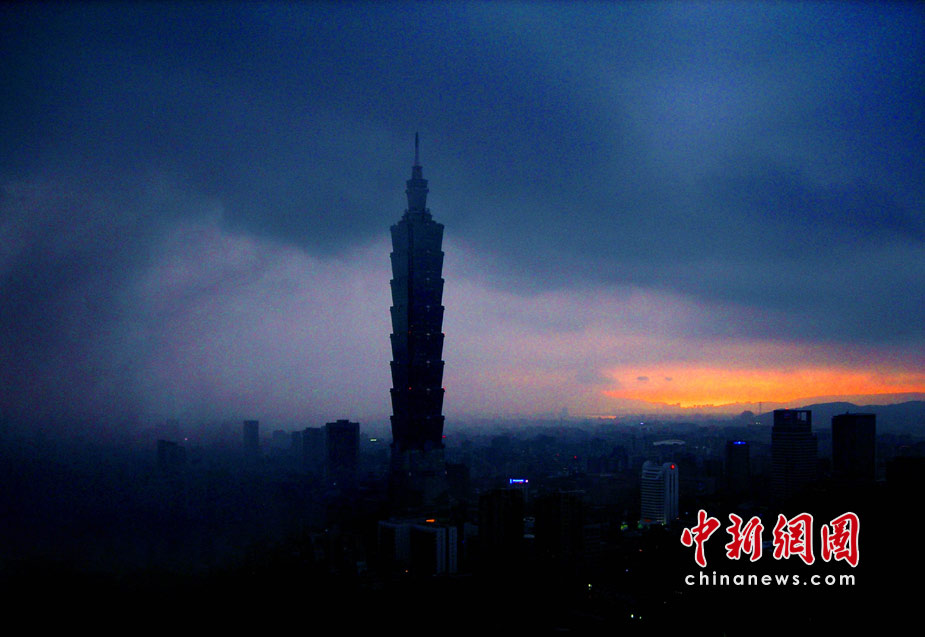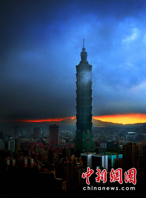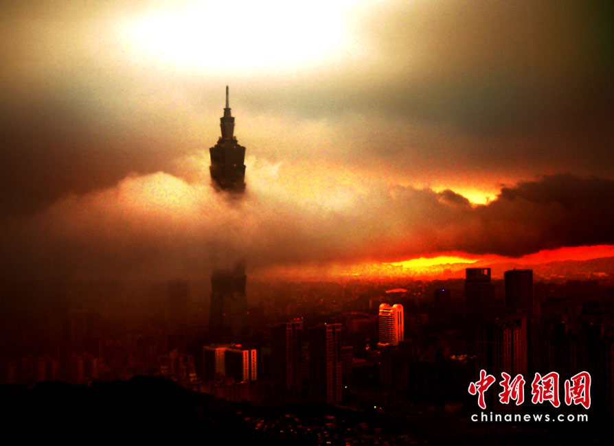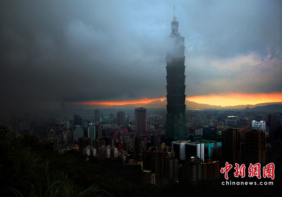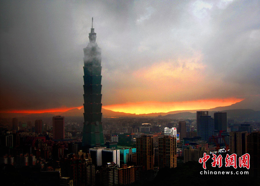 6月28日傍晚,臺北市一陣大雨后,從象山俯瞰市區,101摩天大樓聳入云霄,后山紅云如火,景觀如畫。美麗的臺北市地處盆地,氣候多變,夏季的城市景色也時常變幻莫測。中新社記者 宋吉河攝