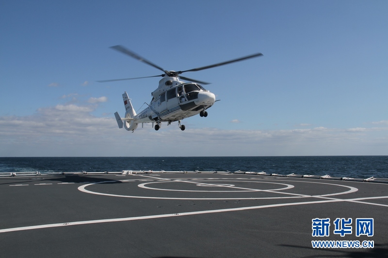 運送“傷員”海監直升機降落在“和平方舟”醫院船。王經國 攝 圖片來源:新華網