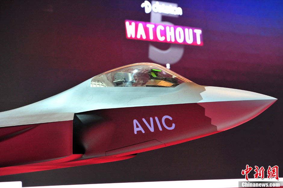 11月13日上午,第九屆中國國際航空航天博覽會在廣東珠海開幕,一架中國先進戰斗機概念模型在中航工業展臺亮相,備受關注。中新社發 陳文 攝