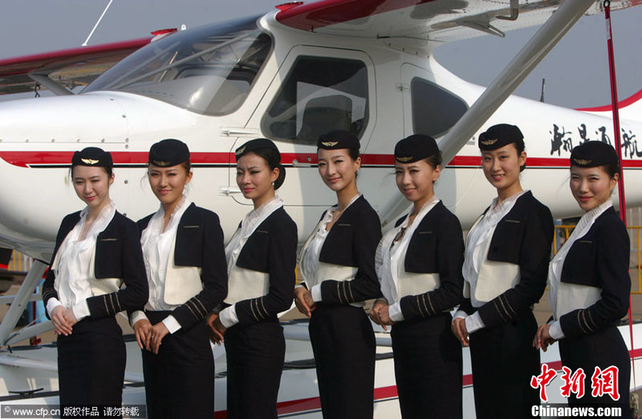2012年11月13日,廣東省珠海市,瀚星通航的準(zhǔn)女飛行員和飛機(jī)亮相航展。圖片來(lái)源:CFP視覺中國(guó)