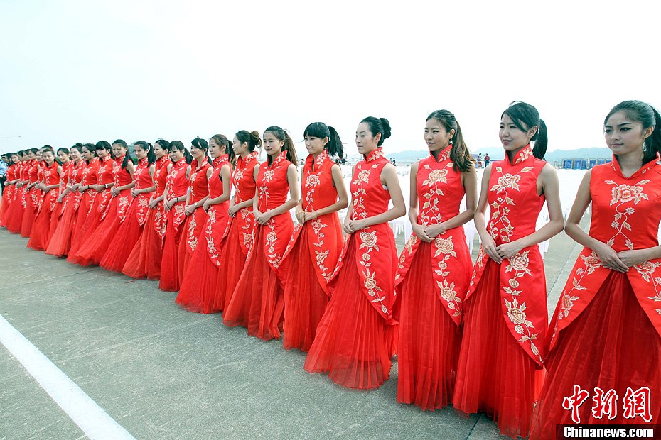 11月12日,準備為珠海第九屆中國航展開幕式服務的禮儀小姐在風中彩排,成為亮麗的風景線。中新社發 洪少葵 攝