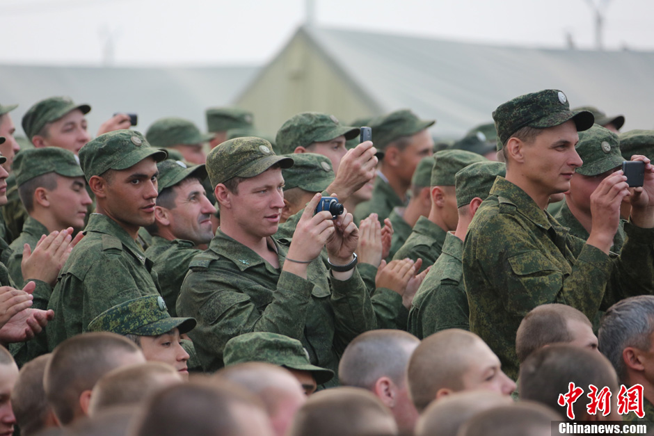 8月10日,隨同中方參演部隊赴俄羅斯參加“和平使命-2013”中俄聯(lián)演的沈陽軍區(qū)政治部文工團演員們,為中俄千余名參演官兵獻上了一場精彩的文藝晚會。豐富多彩的文藝節(jié)目,將位于切巴爾庫爾訓練場的中俄聯(lián)演野營村,變成了友誼的盛會、歡樂的海洋。 圖為精彩節(jié)目吸引俄國官兵。中新社發(fā) 李祥輝 攝