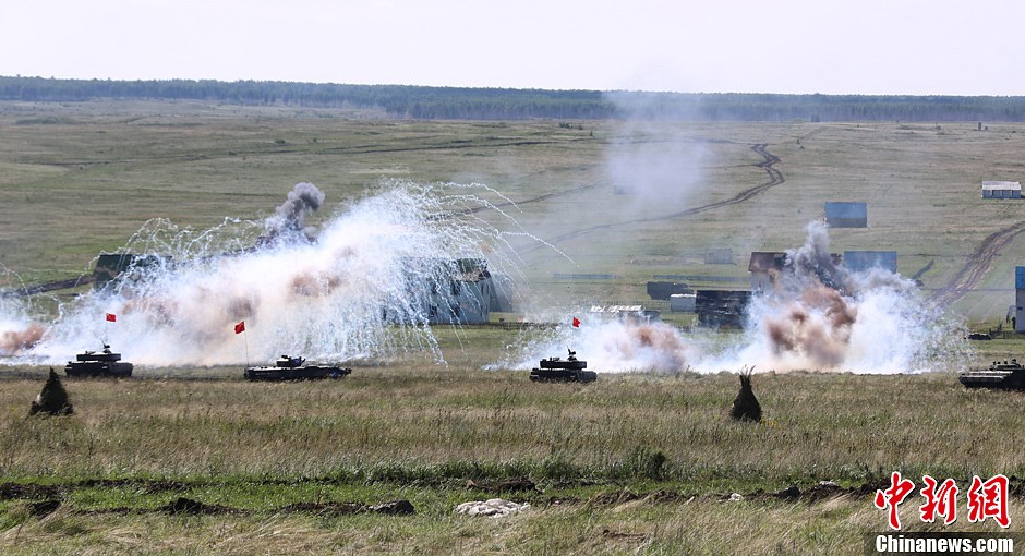 8月12日,“和平使命-2013”聯(lián)合反恐軍演中俄兩軍參演部隊(duì)在切巴爾庫爾合同訓(xùn)練場舉行全員全要素實(shí)兵協(xié)同訓(xùn)練。雙方共出動(dòng)官兵近900人,坦克、步戰(zhàn)車、直升機(jī)等武器裝備約130臺,雙方導(dǎo)演部總導(dǎo)演——俄中部軍區(qū)司令員波格諾夫斯基和沈陽軍區(qū)副司令員石香元,共同到演習(xí)地觀摩并指導(dǎo)兩軍訓(xùn)練。圖為中方坦克戰(zhàn)車對恐怖武裝力量實(shí)施火力打擊。中新社發(fā) 李祥輝 攝