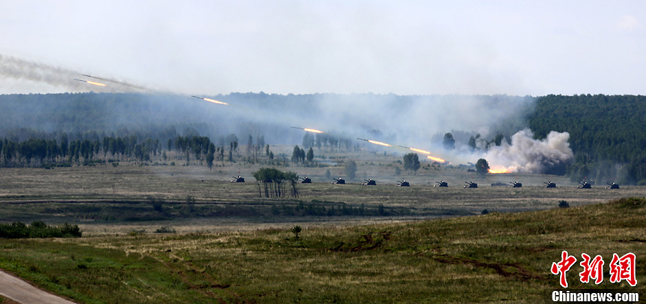 8月12日,“和平使命-2013”聯(lián)合反恐軍演中俄兩軍參演部隊(duì)在切巴爾庫(kù)爾合同訓(xùn)練場(chǎng)舉行全員全要素實(shí)兵協(xié)同訓(xùn)練。雙方共出動(dòng)官兵近900人,坦克、步戰(zhàn)車(chē)、直升機(jī)等武器裝備約130臺(tái),雙方導(dǎo)演部總導(dǎo)演——俄中部軍區(qū)司令員波格諾夫斯基和沈陽(yáng)軍區(qū)副司令員石香元,共同到演習(xí)地觀摩并指導(dǎo)兩軍訓(xùn)練。中新社發(fā) 李祥輝 攝